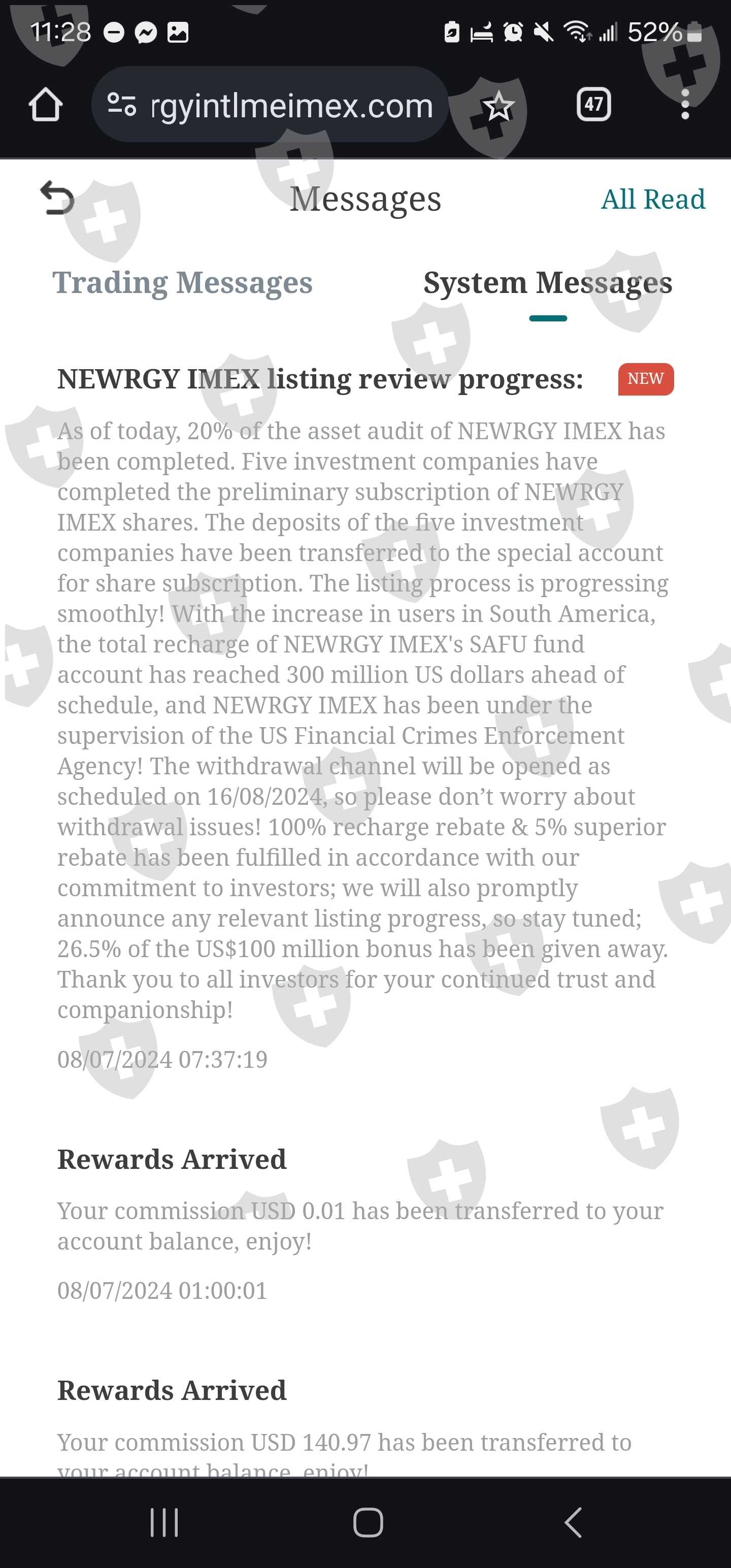 Newrgy states: Newrgy Imex has submitted company assets reports to the US Securities regulatory commission and the New York stock exchange. And we are unable to withdraw until August 16, 2024.