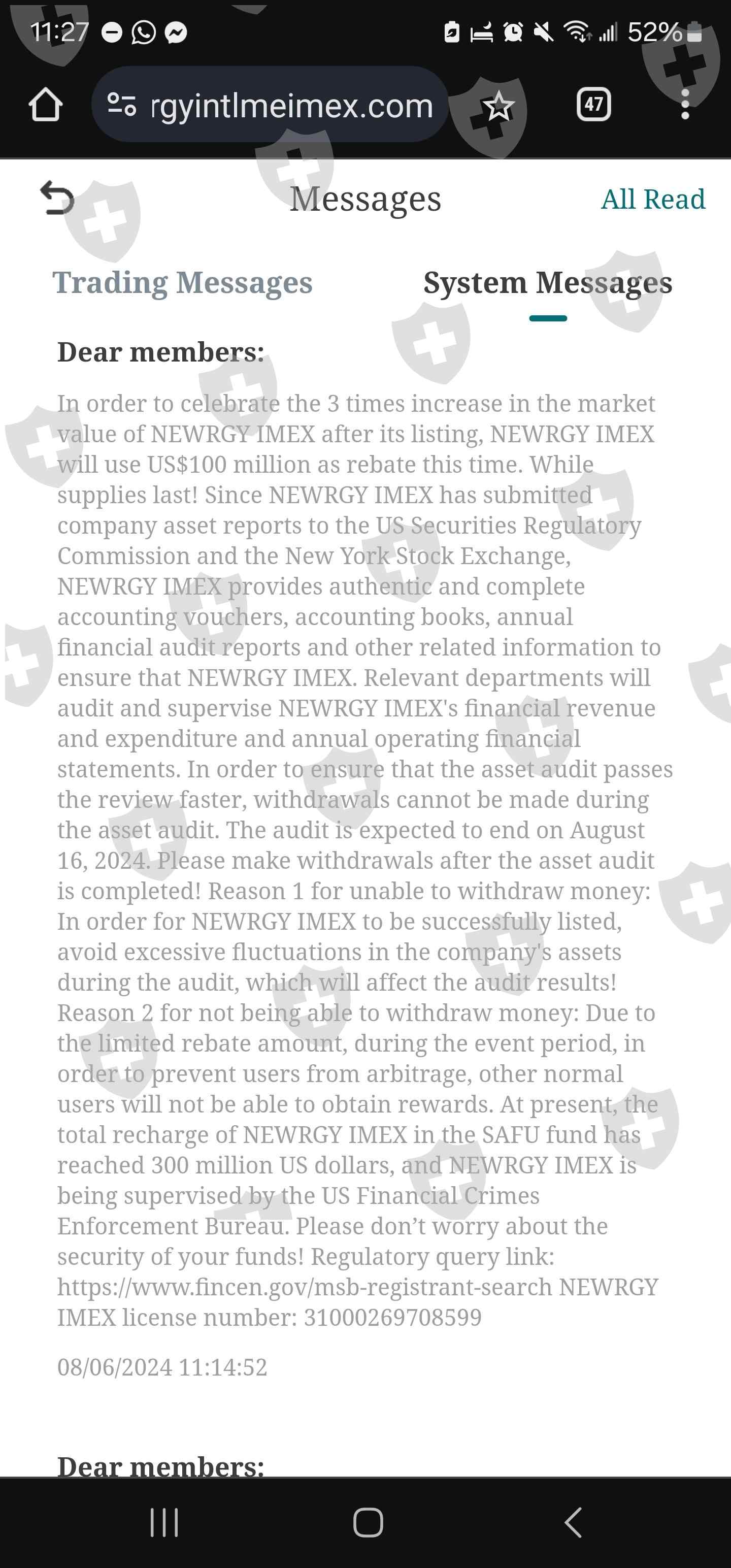 自2024年8月6日,Newrgy禁止出金。Newrgy说:Newrgy Imex已向美国证券监管委员会和纽交所提交了公司资产报告。所以我们在8月16日前无法出金。