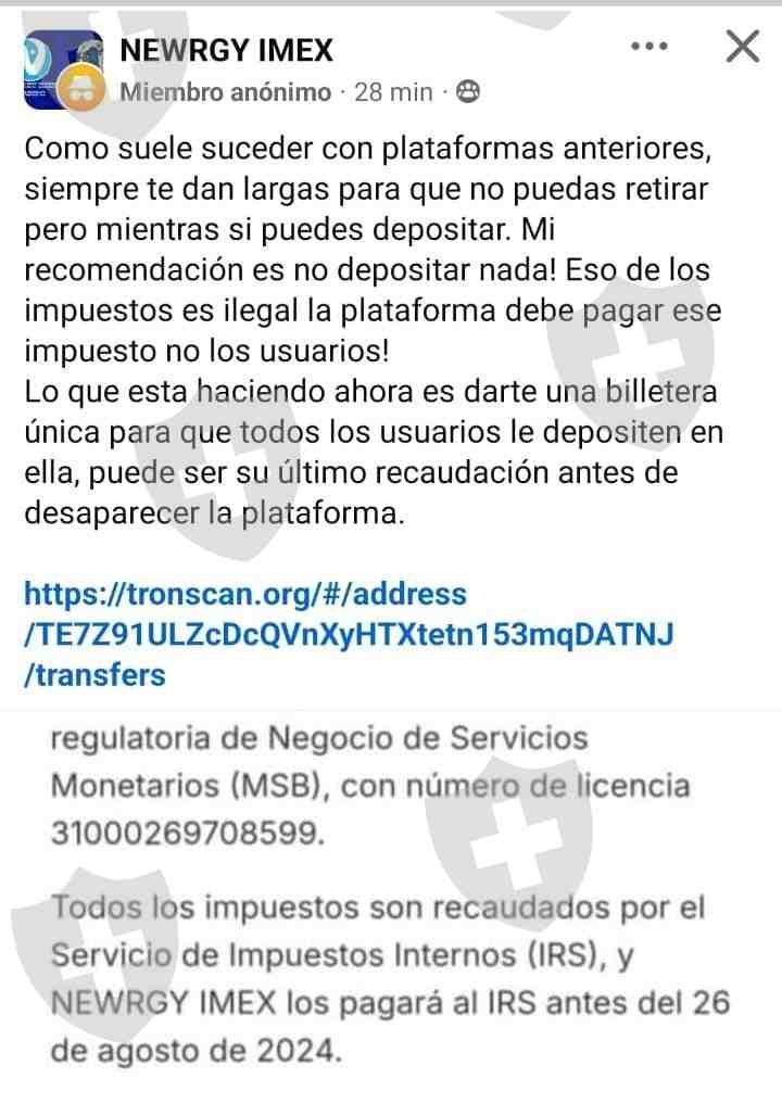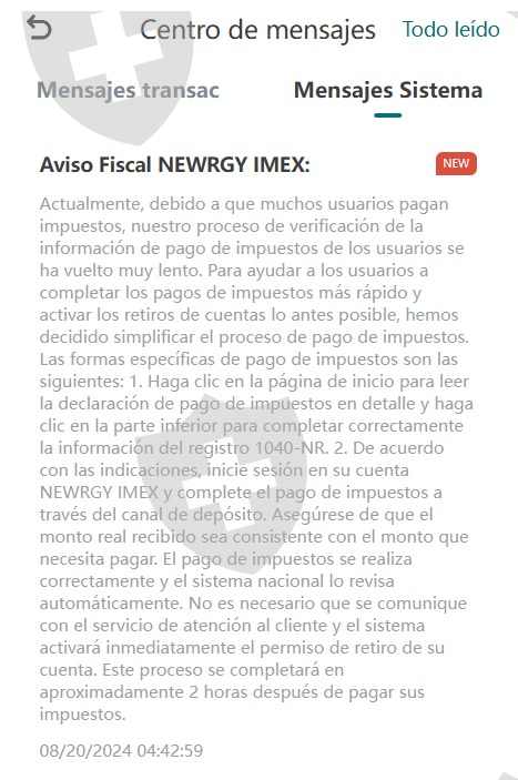 hace 2 semanas Newrgy dió la noticia que comenzó el proceso de ingreso a la cotización de la bolsa de valores, realizaron un primer bloque de cuenta por supuesta auditoria que culminaría el 16 de agosto y en ese momento los retiros estarían habilitados, llegada la fecha procedimos varios compañeros y yo a hacer retiro para protegernos, llegado día lunes 19 de agosto, con la sorpresa que se solicita pagar un impuesto del 20% para liberar los fondos y proceder a retirar, que este iba a quedar libre antes del 26 de agosto.