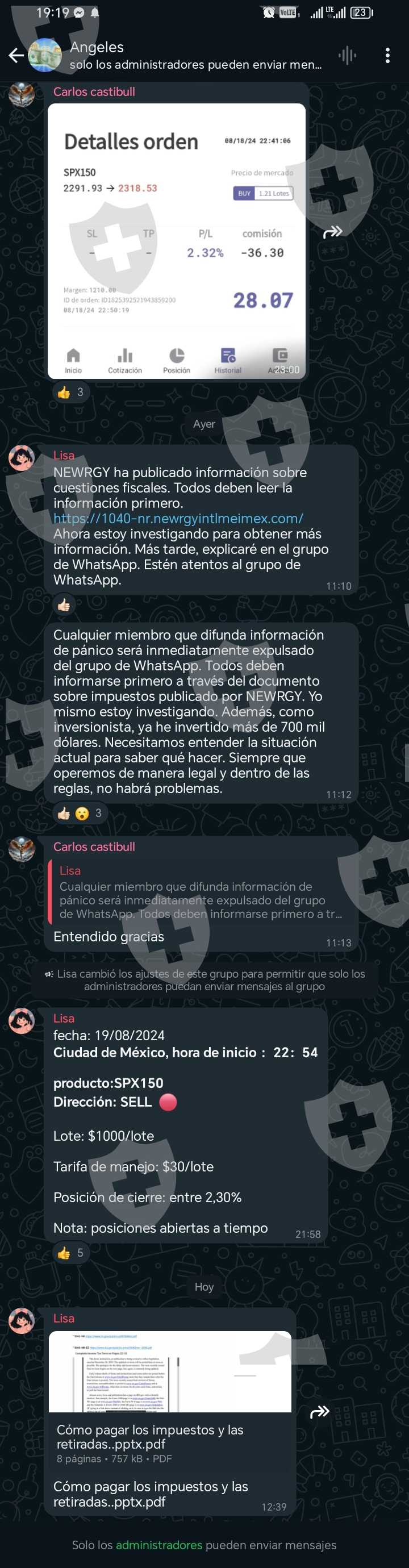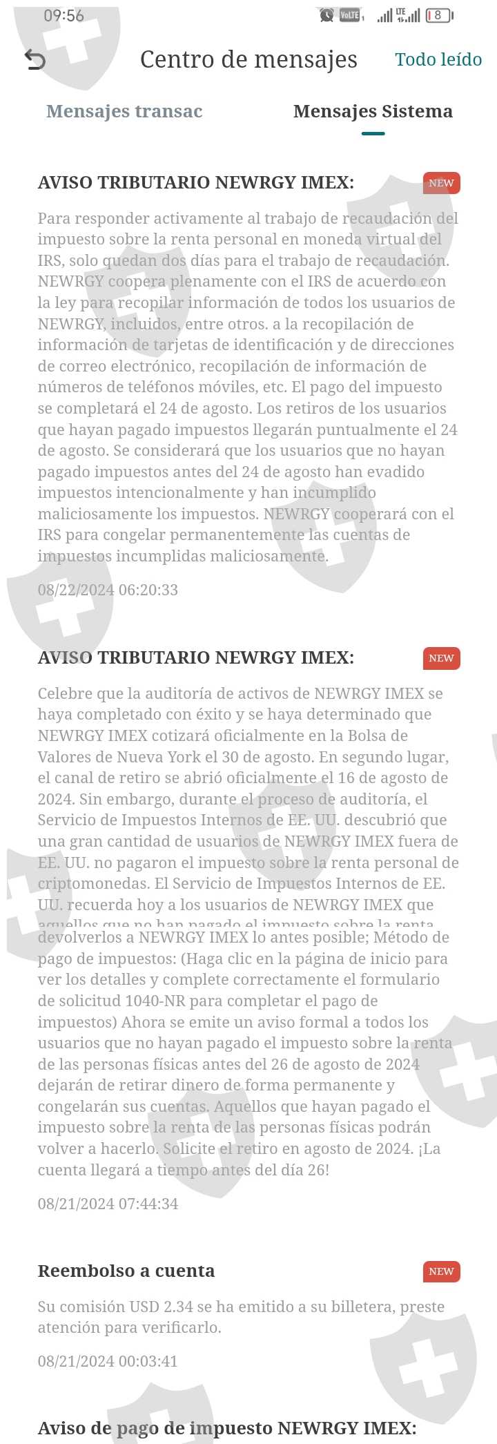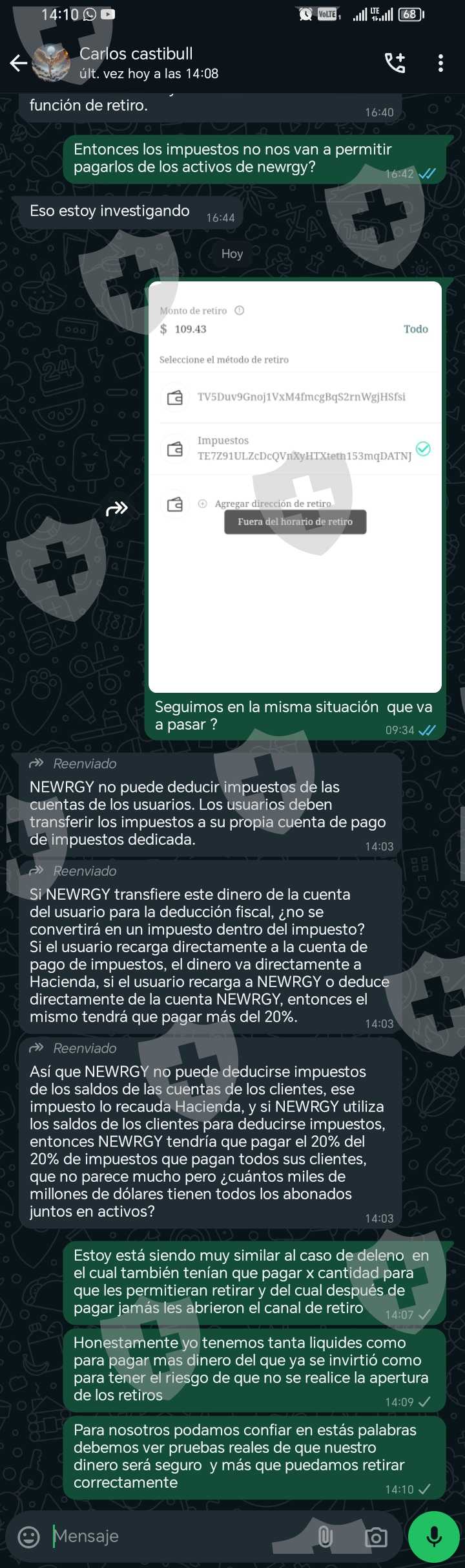 el caso como muchos aquí desde el 6 de agosto es imposible retirar por supuesta auditoría para cotizar en la bolsa de valores con promesa de que el 16 de agosto abrirían los canales de retiro. y solo para que el 19 volvieran a cerrar los canales de retiro y los retiros solicitados el 16 de agosto fuesen rechazados y ahora solicitan un supuesto 20% de los activos para pagar impuestos ante el IRS en EEUU pero se le debe depositar a newrgy imex ahora los grupos de WhatsApp que estaban activos para los miembros están cerrados