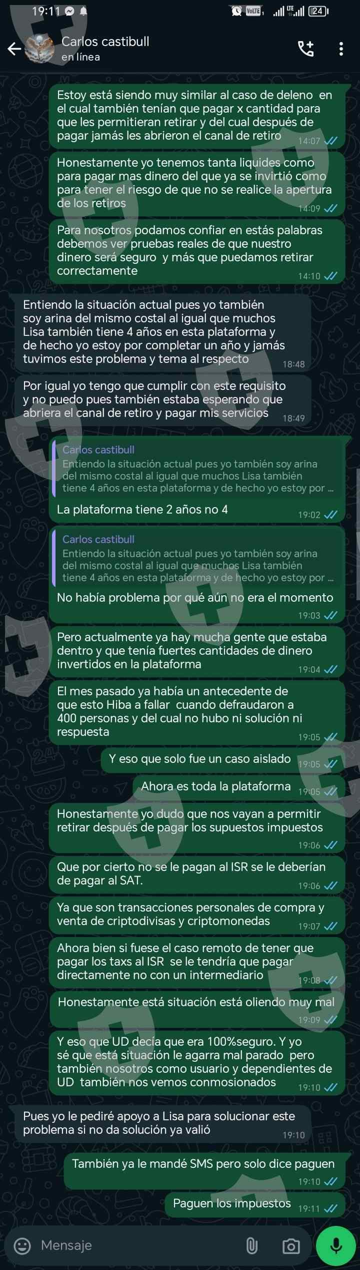 自8月6日以来,像许多人一样,由于所谓的审计要在股票交易所上市,无法提取款项,承诺提款渠道将于8月16日开放。然而,他们在19日再次关闭了提款渠道,并拒绝了8月16日提出的提款请求。现在,他们要求支付所谓的资产的20%作为向美国国税局缴税,但必须存入newrgy imex。现在,成员的活跃WhatsApp群组已关闭。