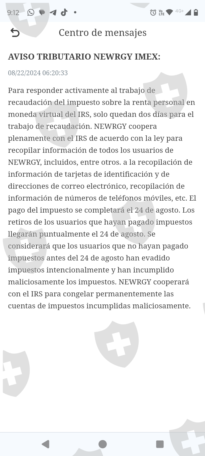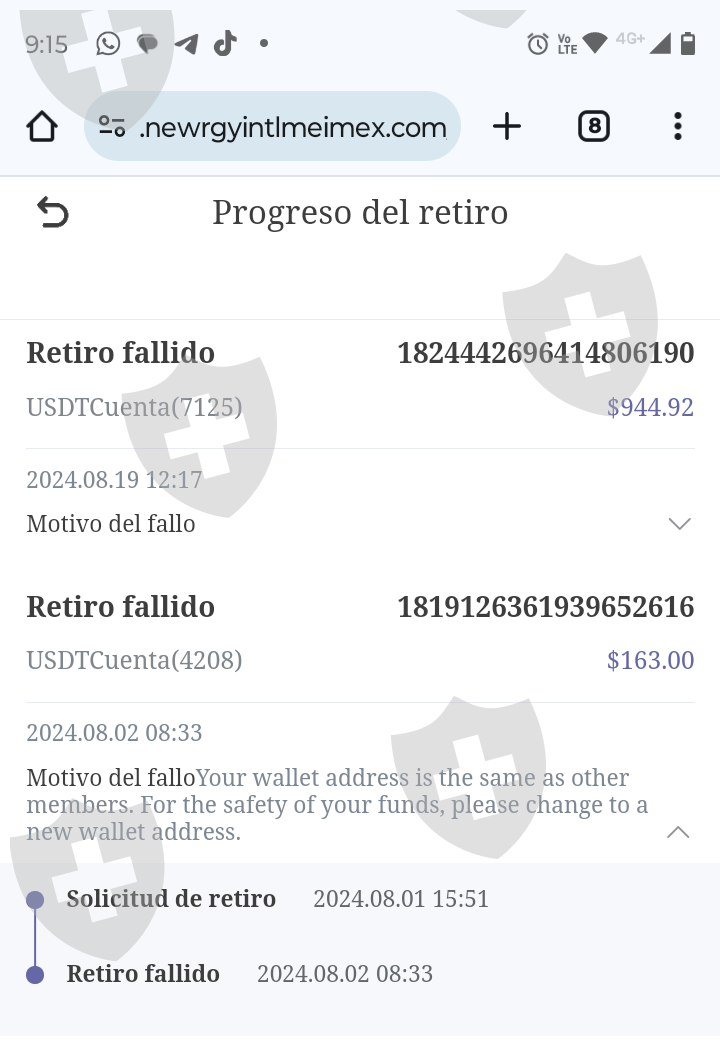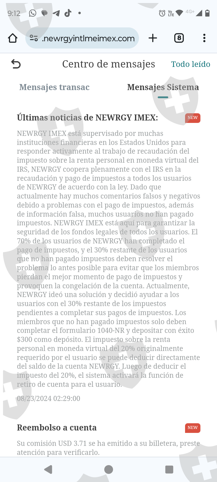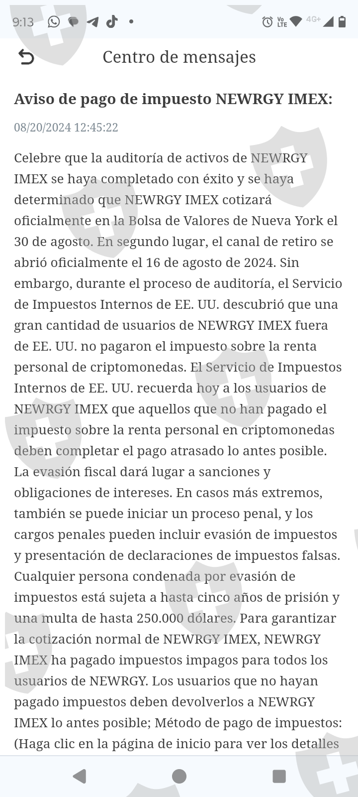 Desde hace más de 3 semanas no permite hacer retiros, por un supuesto ingreso a cotización en la bolsa de valores de Nueva York, en el que también agregan un supuesto impuesto del 20% por operar en newrgy imex, dónde amenazan con congelar las cuentas si no se deposita dicho impuesto, y si no hacemos caso a este pago, nos llamara la oficina de recaudación de impuestos de Estados unidos y podremos tener un proceso penal o una multa de hasta 250,000 dolares