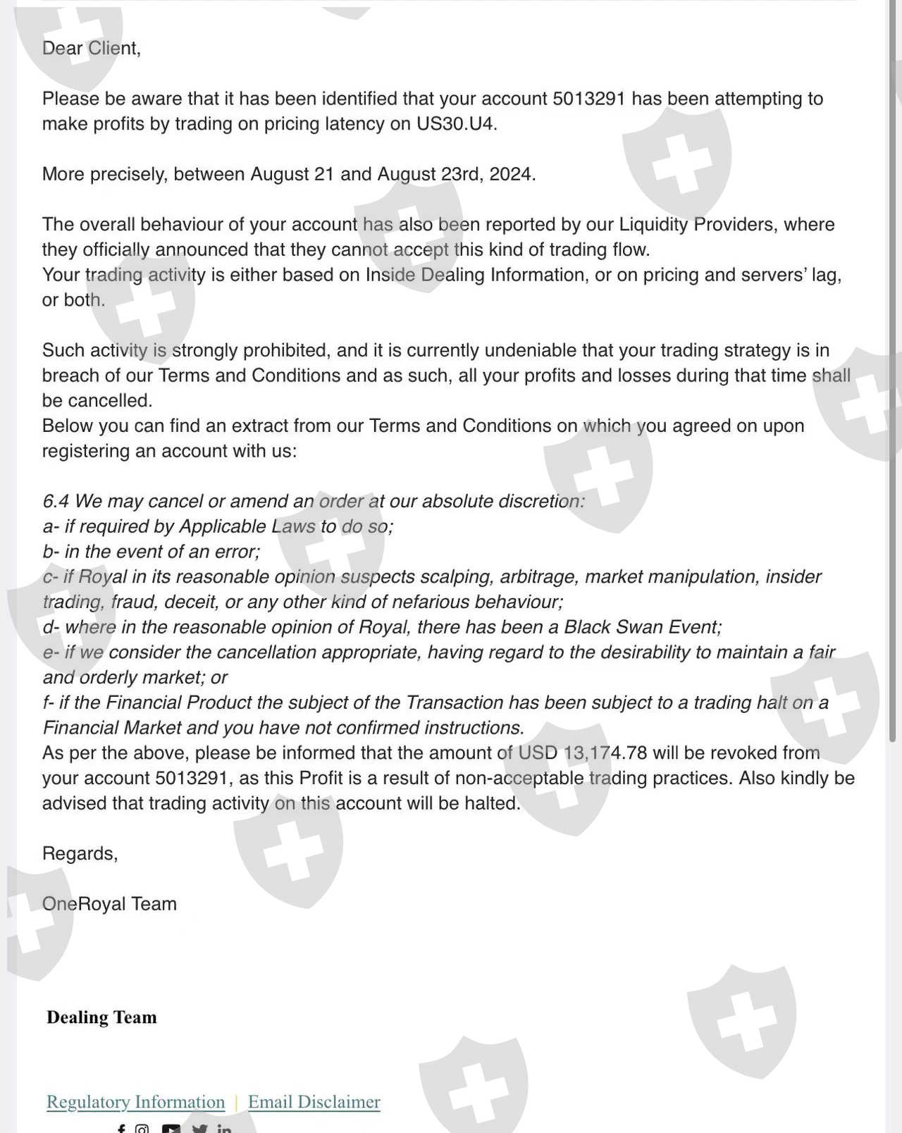 赚钱扣除,说我可能提前预知行情或者使用ea进行交易。现在平台扣除盈利的理由真的越来越奇葩。我不是先知也没有使用任何的套利策略。另外我开户的时候业务员也告诉我,没有任何交易限制。然后现在赚钱找理由扣除。大家千万不要考虑这个平台。后续只能找国外律师去他们牌照注册地或者展会维权了。交易账户5013291