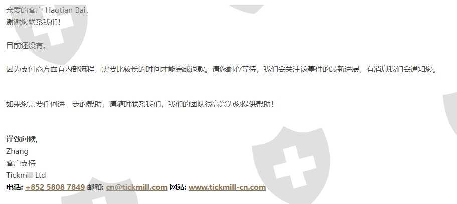 我将证据截图发给Tickmill平台,平台客服立马改口说要给退款,但是需要时间。