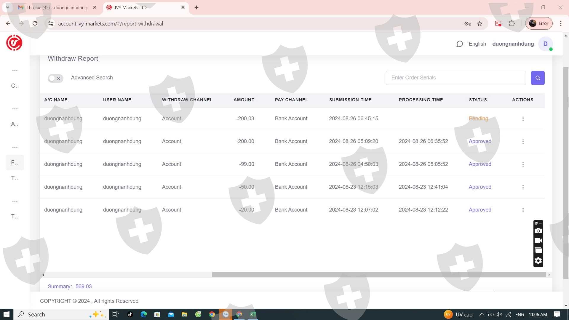 - On August 26, 2024, I submitted a withdrawal request for the amount of 200$ from my trading account to my bank account (Vietinbank - 100877747399). However, I have not received the funds in my account to date.