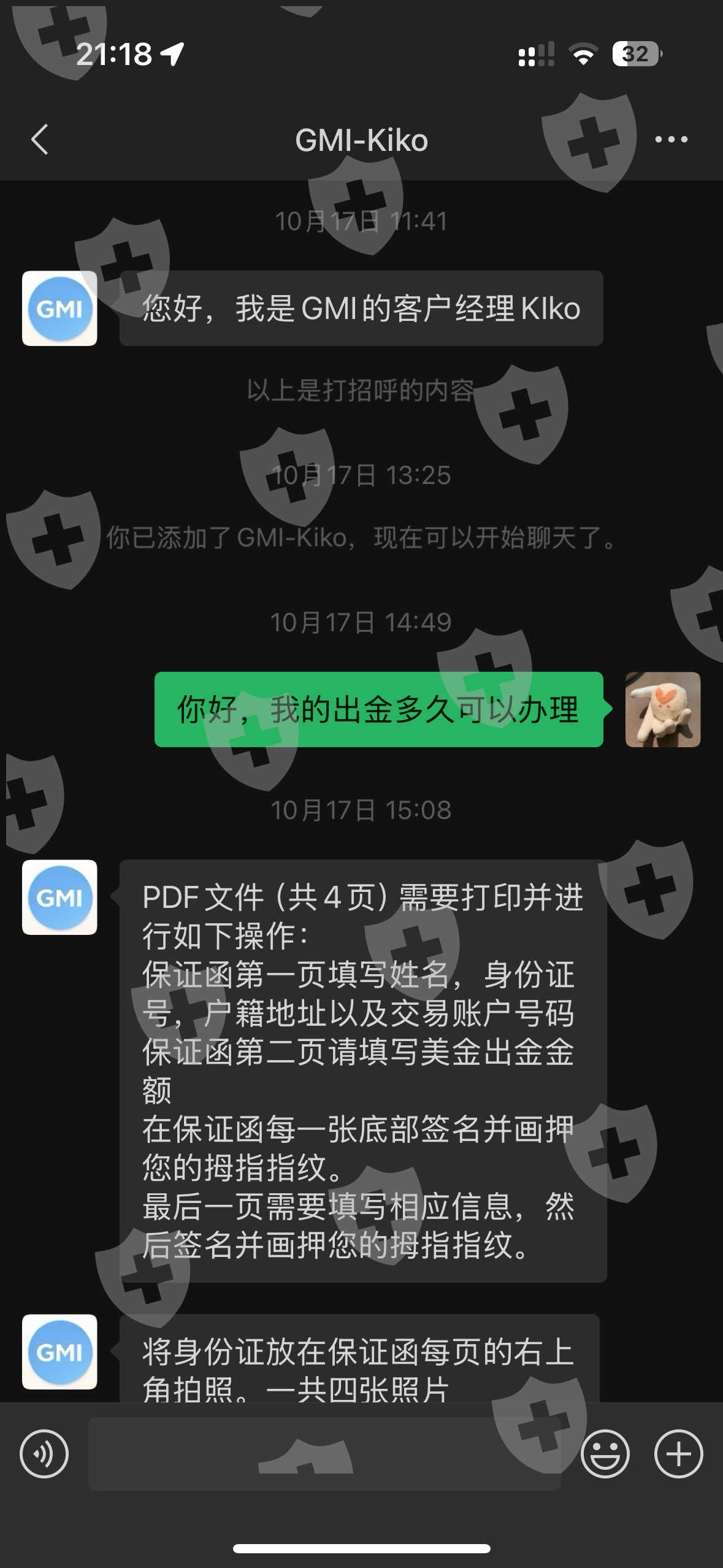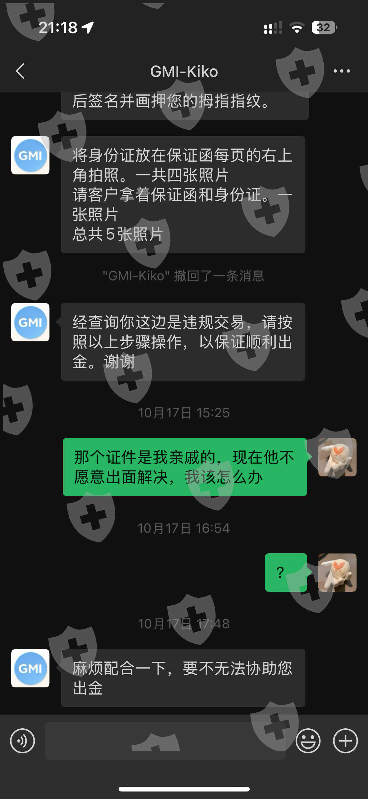 我通过亲戚身份证开户入金到GMI交易正常盈利,后来10月初无法出金也无法交易。要求提供保证函才能出金,必须承认交易不合规。亲戚非常介意提供这类信息导致我无法提供保证函,并且也要求GMI扣除盈利退还我的本金,本着友好协商的态度,一直协商沟通一个月,客户经理不回复我,客服也无法处理