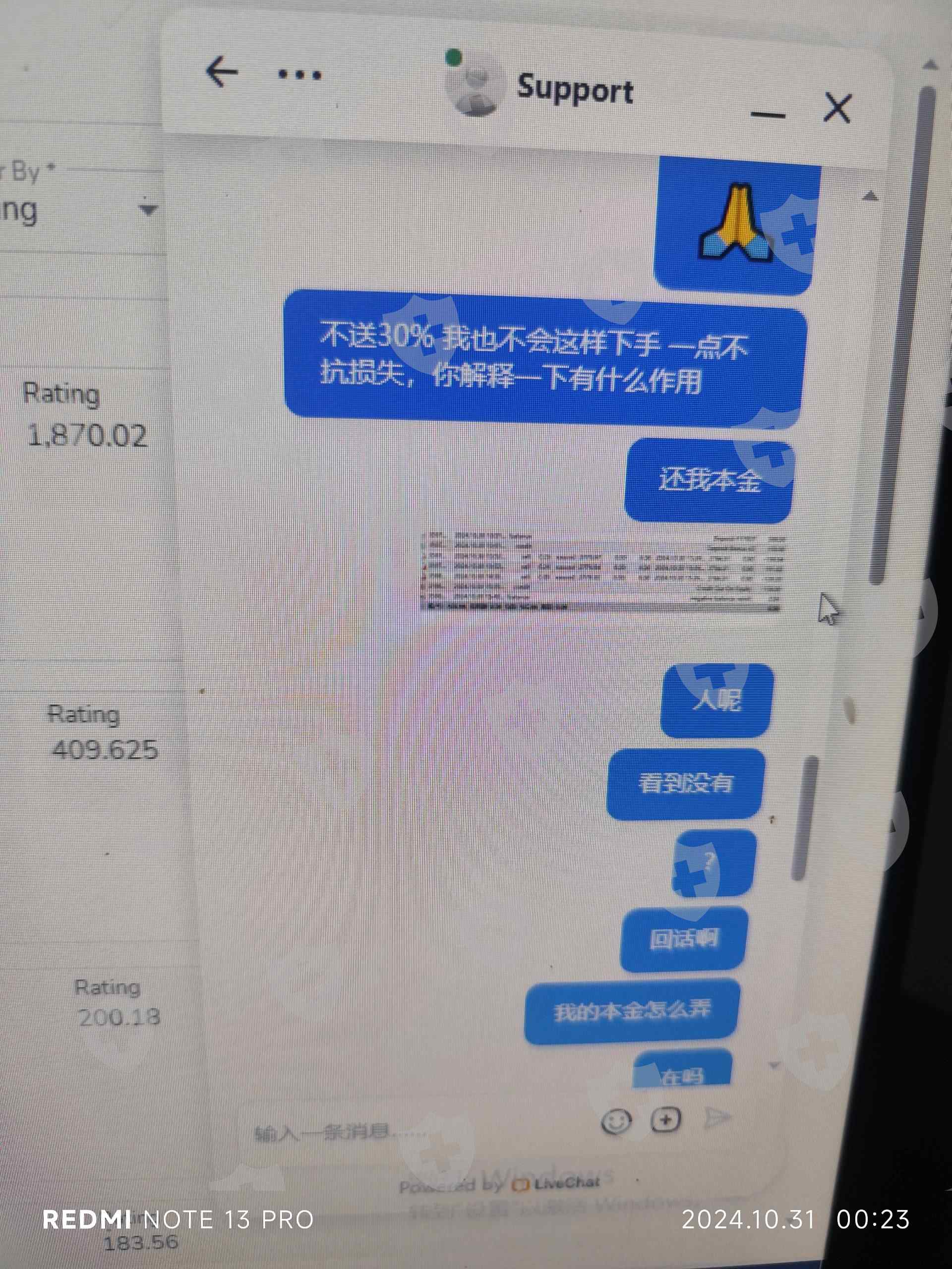 返还本金,返还本金,500美刀。返还500美刀。打着赠送活动,输了赠金一点不管用,净值还有170瞬间消失。联系客服也不回