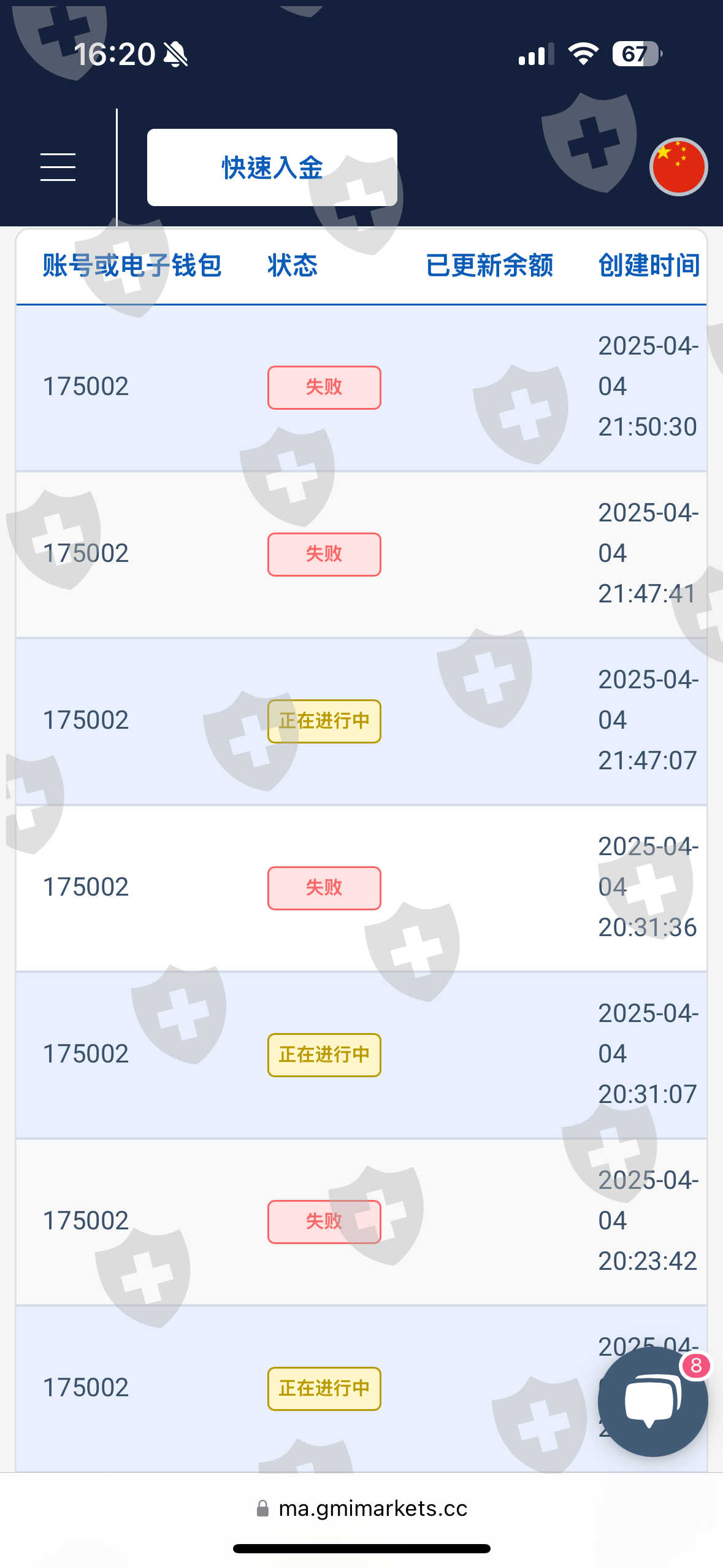 2025年4月4号,周五,北京时间晚上10点左右,我持仓白银加原油,账户2700美金,行情波幅较大,我看着账户有可能有危险怕爆仓,就立刻入金,金额7千到8千,前前后后折腾了一会,尝试了GMI提供的入金渠道,数字货币渠道进去没人接单,银联通道跳转页面没有收款人,最终无法入金导致爆仓,而行情在爆仓后立马大涨,我账户但凡有一次入金成功都不会爆仓,可笑的是,我爆仓后就变一切正常,入金可以正常入了。