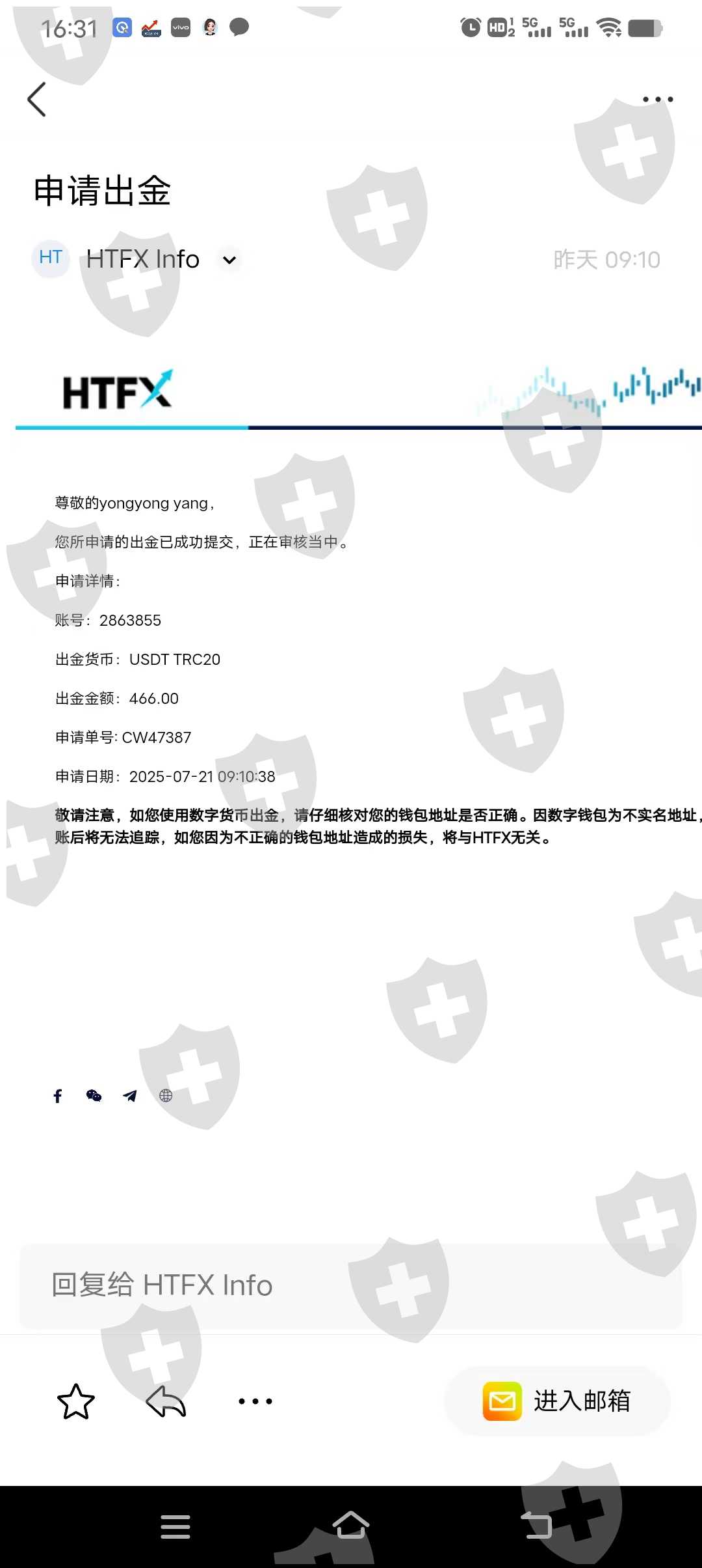 上周一出的金,8个工作日了!还没到账,目前还没有到帐,我出的欧意