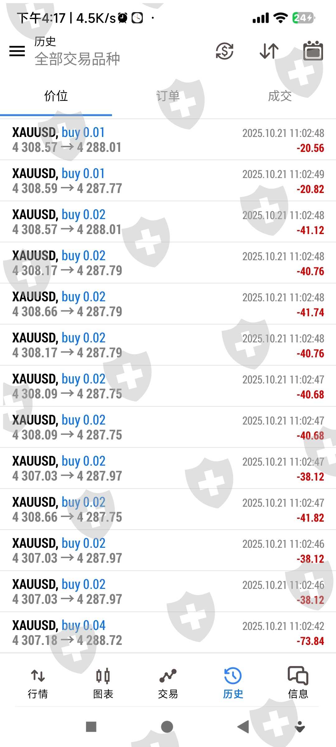 连续下21单群通知EA失控,第五张图联系过客户经理确认过不会爆仓,2025.10.21.11.02.42开始爆仓,合作讲好是下单0.01手一单一结,今天不按规定手数下单,昨天是盈利一单下一单,亏损600多美金申请赔付回来 交易帐号300378可查交易记录