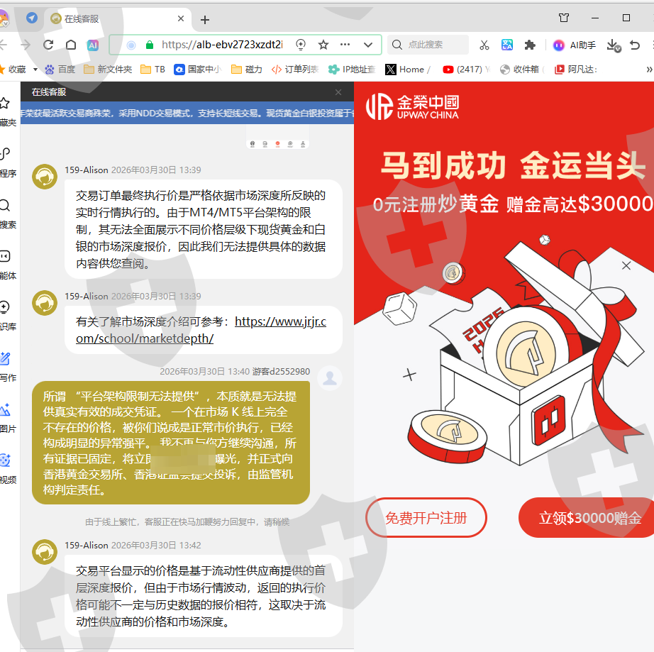 现已保留完整证据:订单截图、K 线图、聊天记录,将同步投诉至香港黄金交易所 KGX、香港证监会 SFC,曝光平台价格操纵、侵害投资者利益行为。