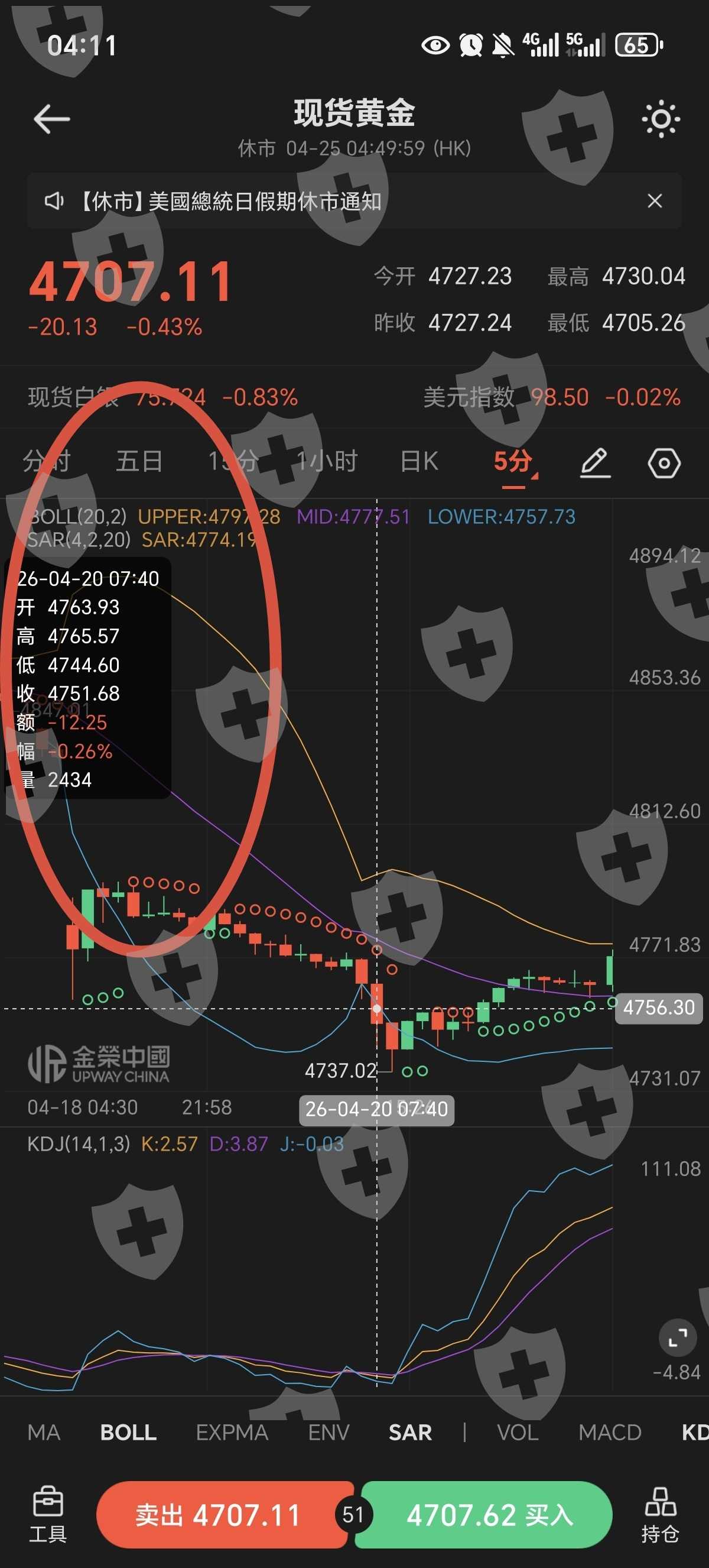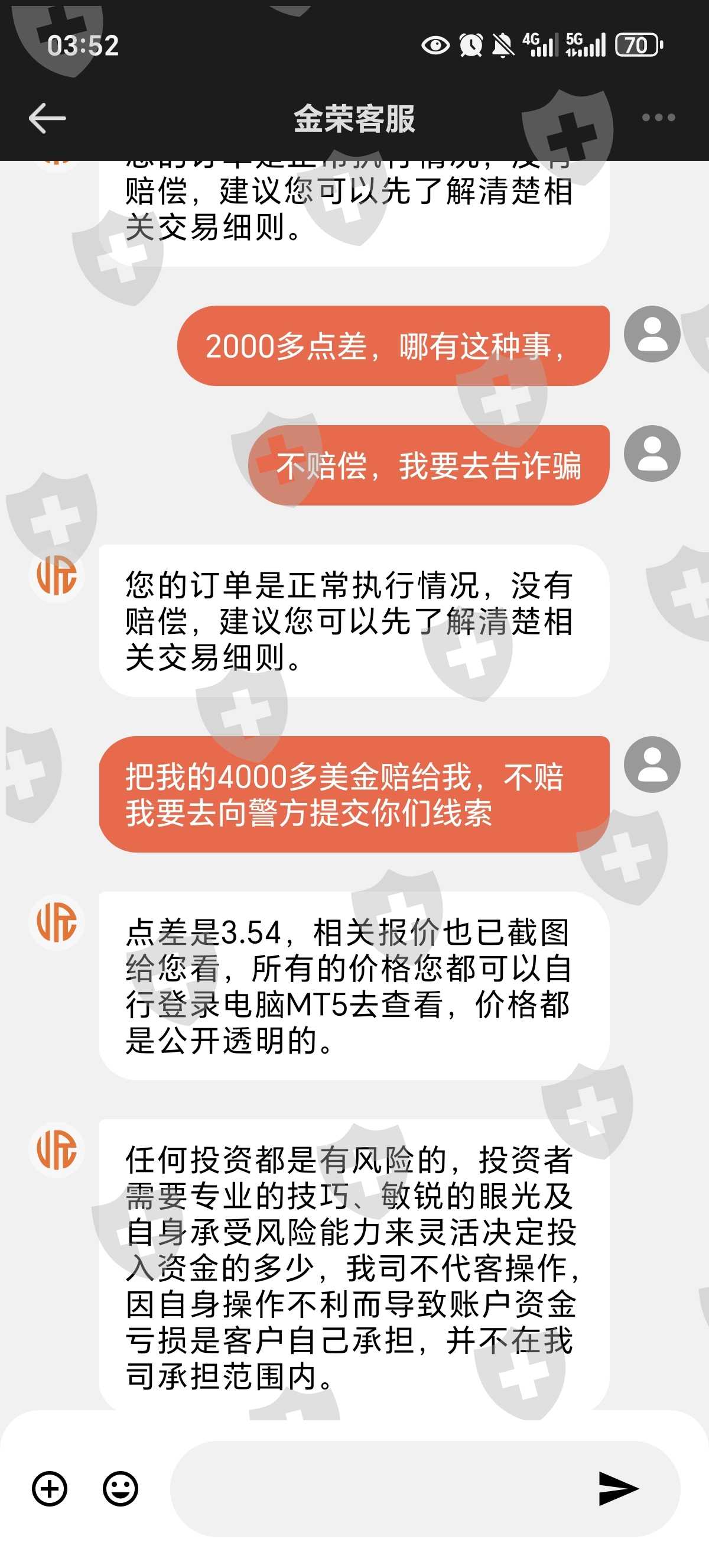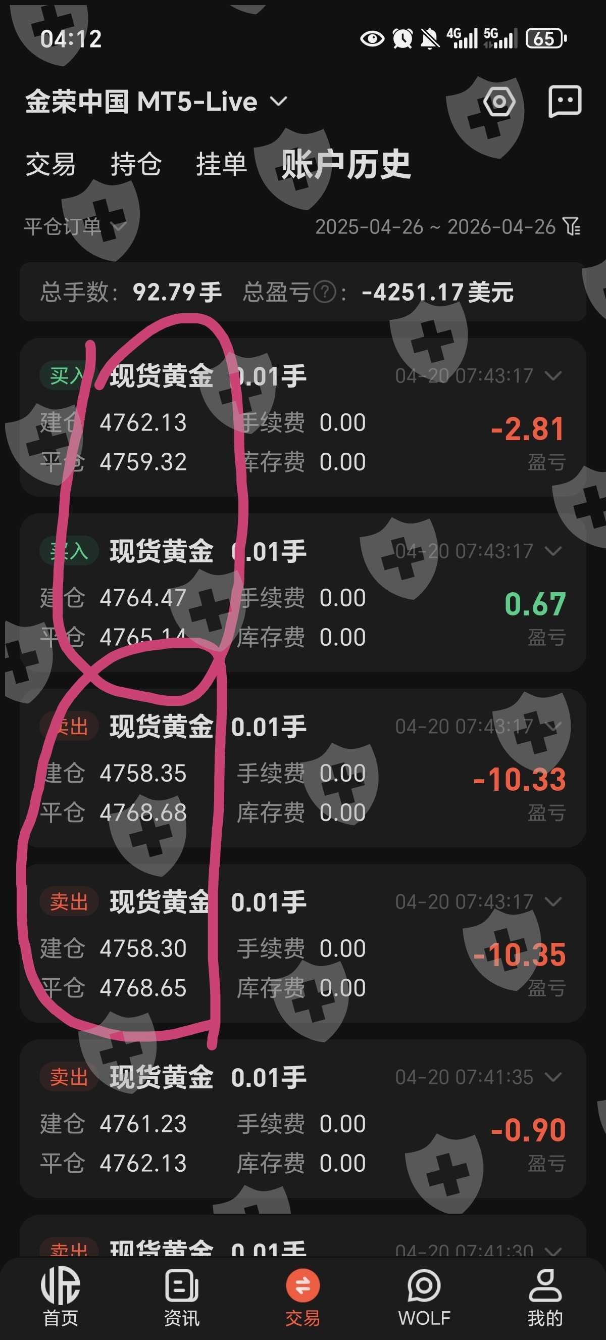 金荣中国,4月20号,7.43分,已不存在的市场价格强平我的多空锁仓单子,此时已经开盘一个多小时,他们点差是20,他们客服解释说此时调查扩大到354点,这简直是严重操控价格和点差。哪家平台有这么大的点差,而且开盘近两个小时了。4月20号,07:43:17,强平我4个单子,两个多单强平价4759.32,4765.14,空单:4768.68,4768.65。而且此时7.43的K线行情最高点才4765.57,完全没有4768.65这个价格。这简直是乱搞,诈骗。非常不公平。导致我亏损,这次是其中一次,多次遭到不公平待遇,共计亏损4300美金,要求金荣中国给我赔偿我本金4300美金。