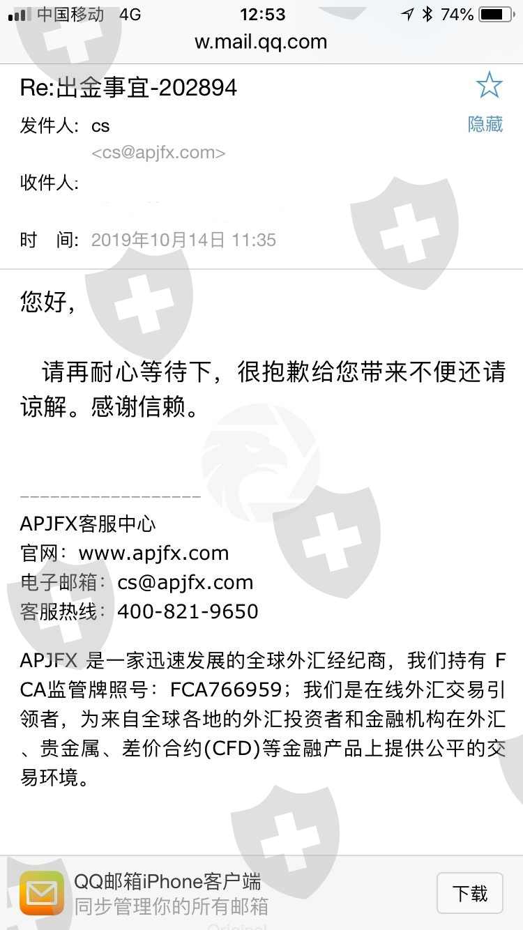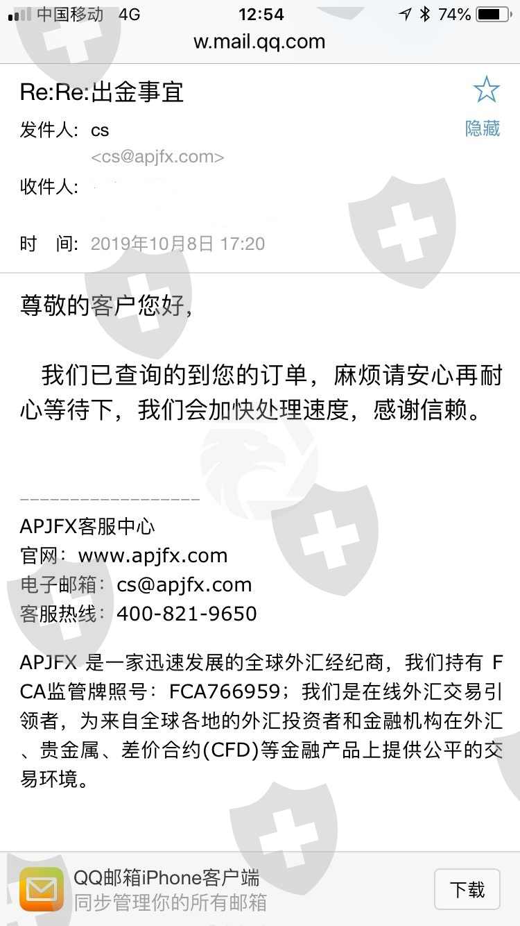 APJ一直说耐心等待,耐心等待;这要等到猴年马月吗?9月份提交的出金申请;现在网站打不开。APJ一直是在CCTV证券资讯频道上节目的;现在居然突然不出金,也没有道歉信,怎么回事也不公开向投资者说明。这不是一个有责任的体现;以后大家最好玩国内期货;或者去海外开户。自己去英国开户,远远比这些代理公司安全的多。