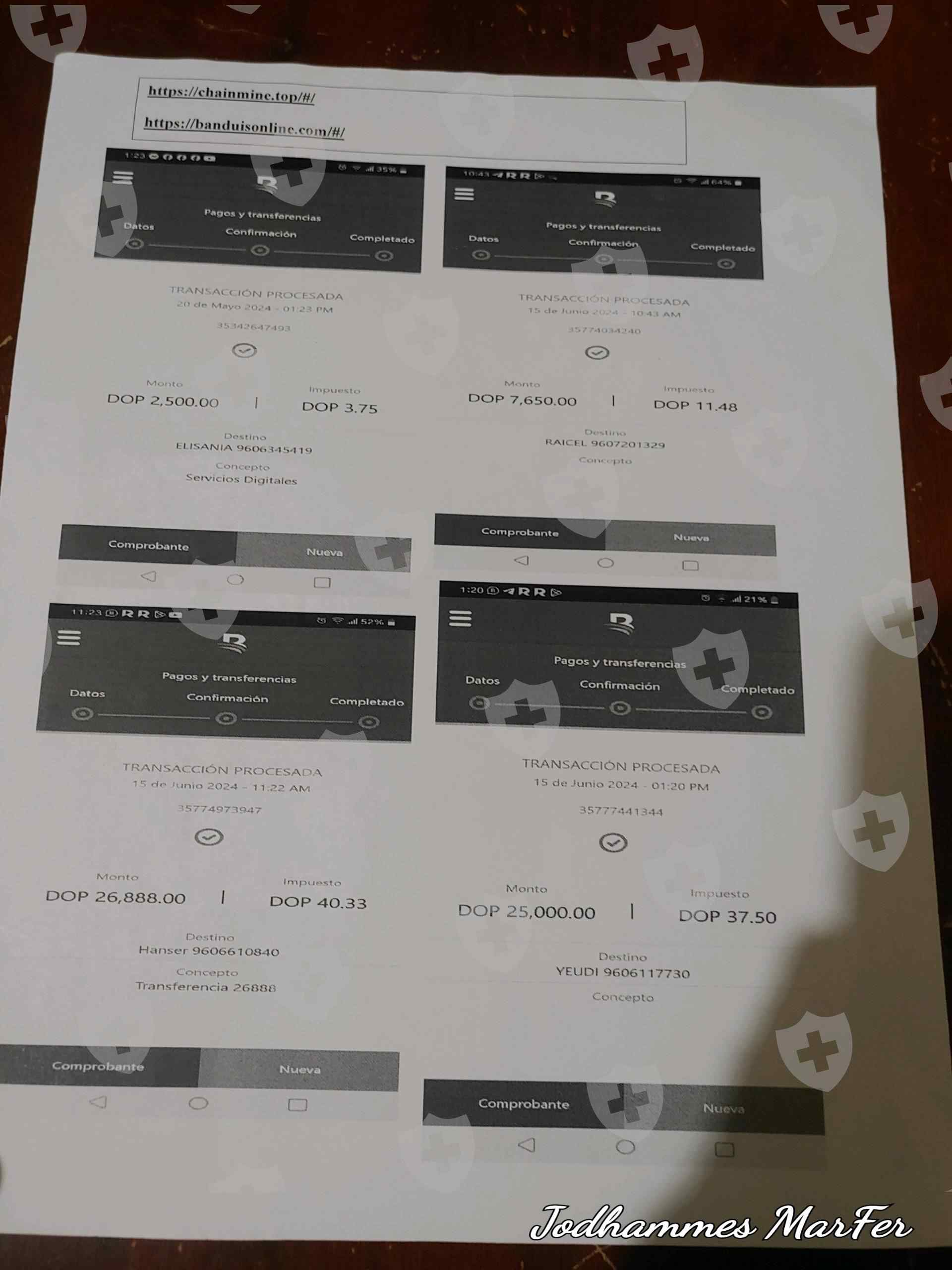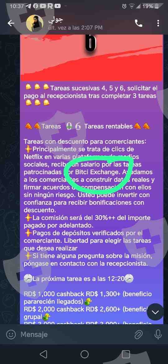 事实证明,每次我存入不同的账户并据称赚取一定比例时,当我去取款时,他们会冻结我的钱,据说是因为我采取了错误的行动,并修复了他们要求我存更多钱的情况。他们在 Telegram 上有聊天帐户,但不反映他们的电话号码。金额越来越高,支付能力变得不够。他们时不时地将聊天内容从名字改为图像。我想要我的钱。我投资了 170,396.00 DOP,预计赚取 216,539.00 DOP。收回我的投资。称为比特西。他们使用以下页面:https://banduisonline.com/#/ https://chainmine.top/#/
