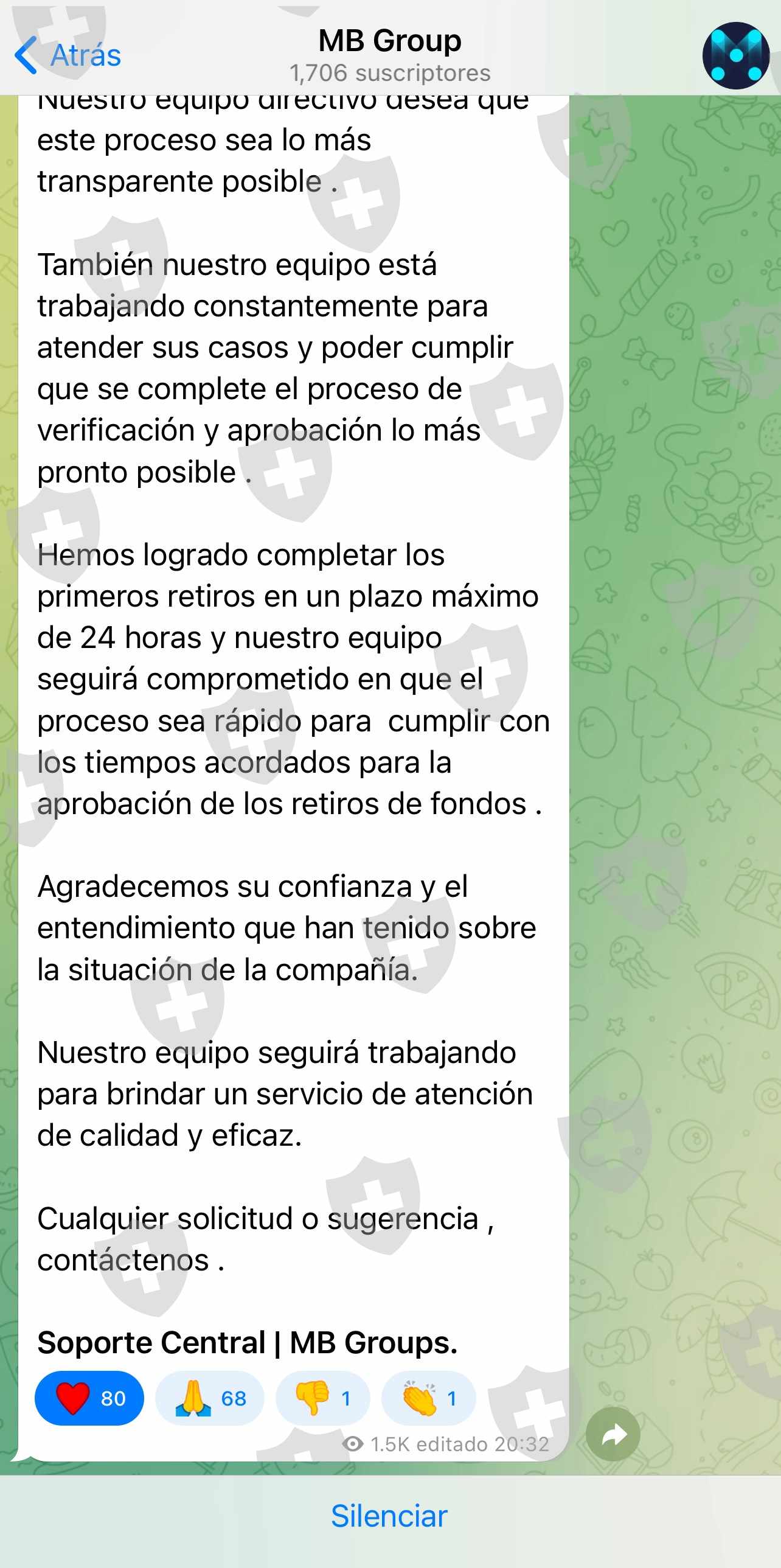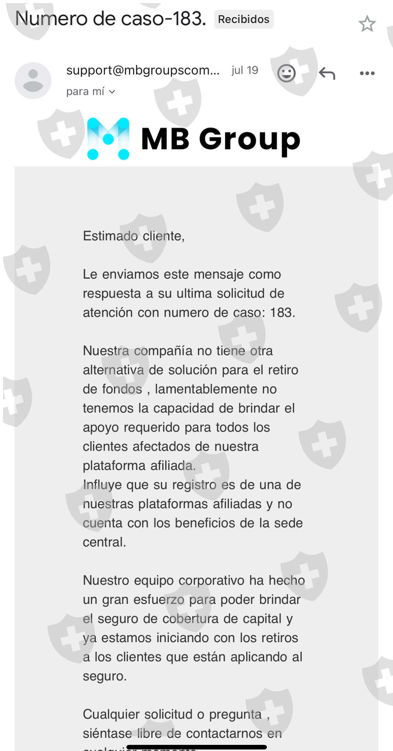 invertí en la plataforma de mbgroups y cuando solicite retirar mi dinero , me solicitaron un pago de tarifa del 19% y luego me pidieron pagar otra tarifa . Cuando complete los pagos igualmente no recibí mi dinero … luego de varios días se contactó conmigo la empresa explicando que sus agentes cometieron fraude y que nos iban a ayudar .