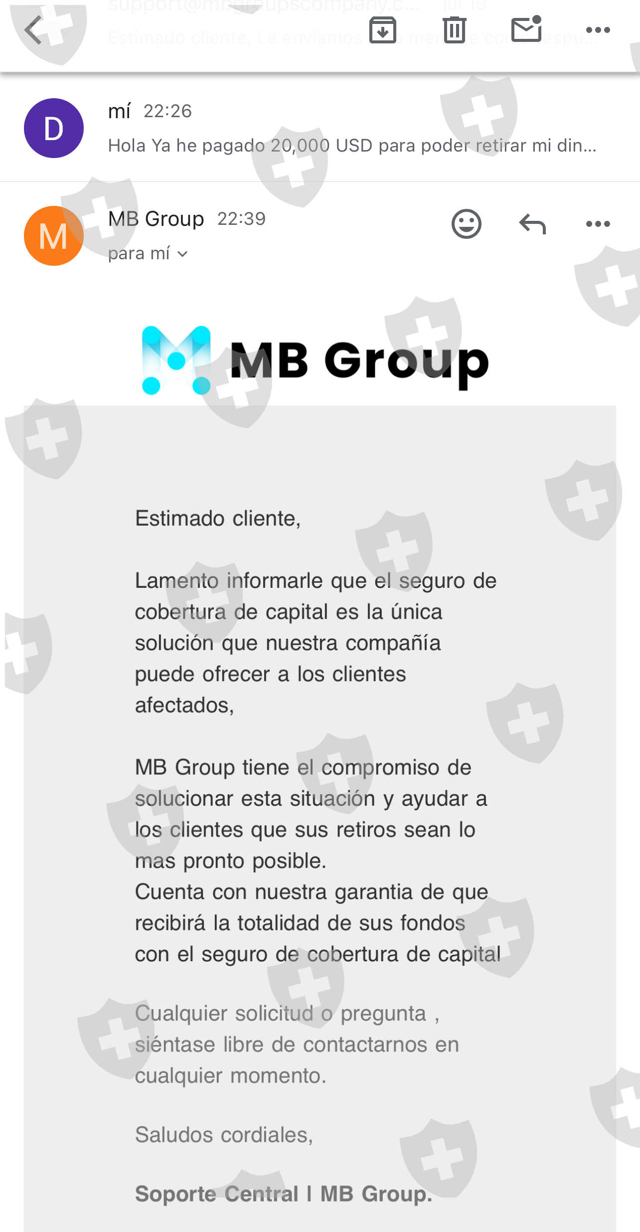 我投资了mbgroups平台,当我要求提款时,他们要求我支付19%的费用,然后要求我支付另一笔费用。当我完成付款后,我仍然没有收到我的钱......几天后,该公司联系我,解释说他们的代理人犯了欺诈行为,他们将帮助我们。他们发来一份声明,解释说我们只能在有保险的情况下提取和追回我们的钱。据说他们应该以另一种方式帮助我们,我有什么保障或保证这次他们会付钱。我不想再被骗了,拜托,我只想拿回我的钱。帮我