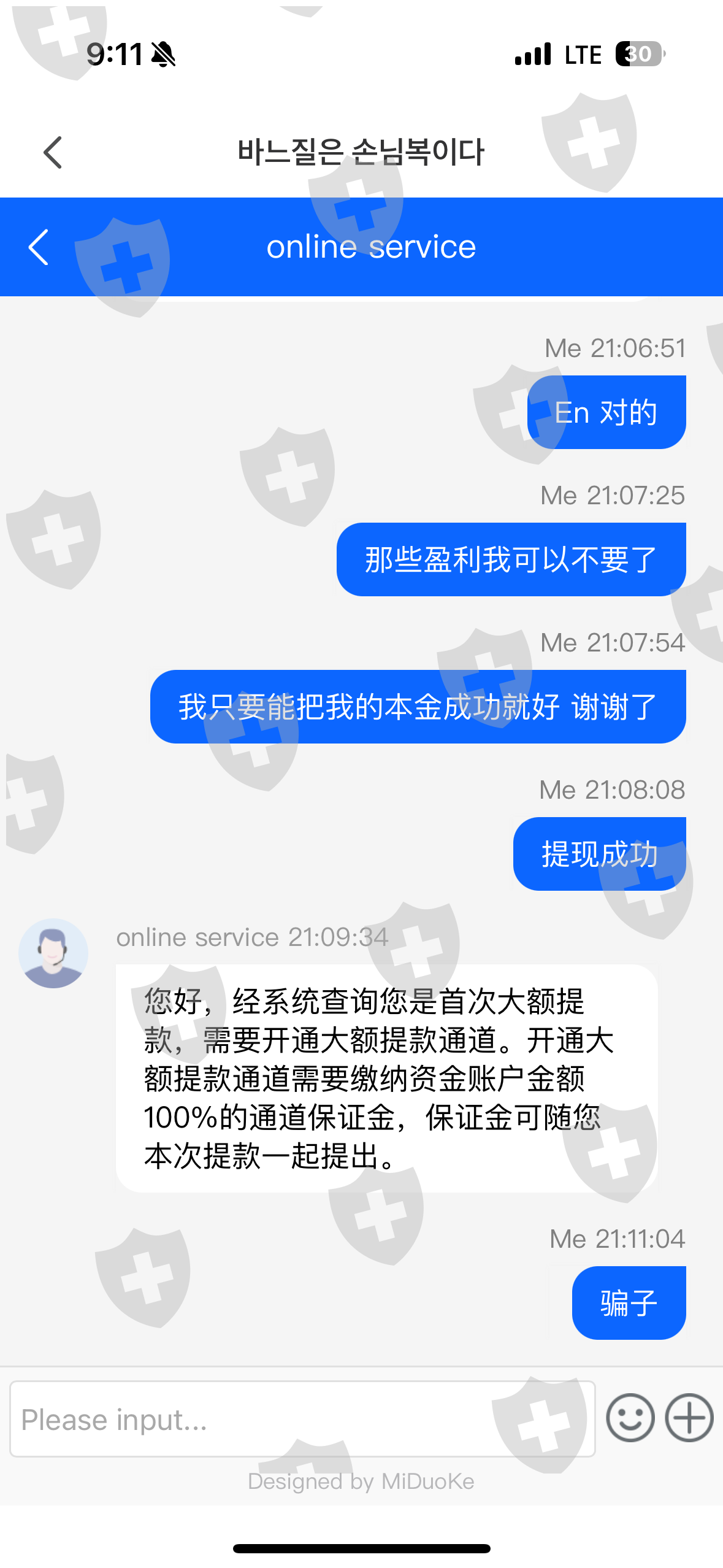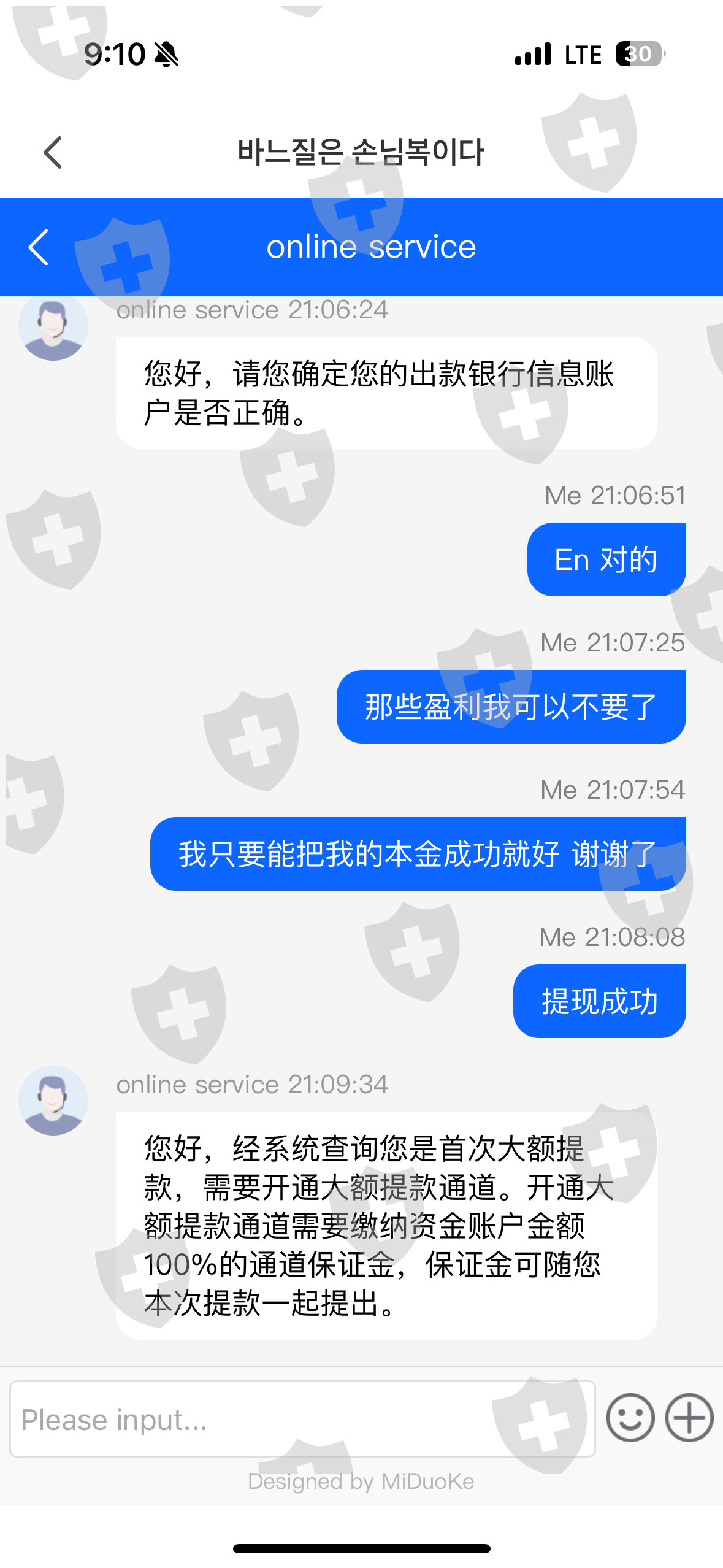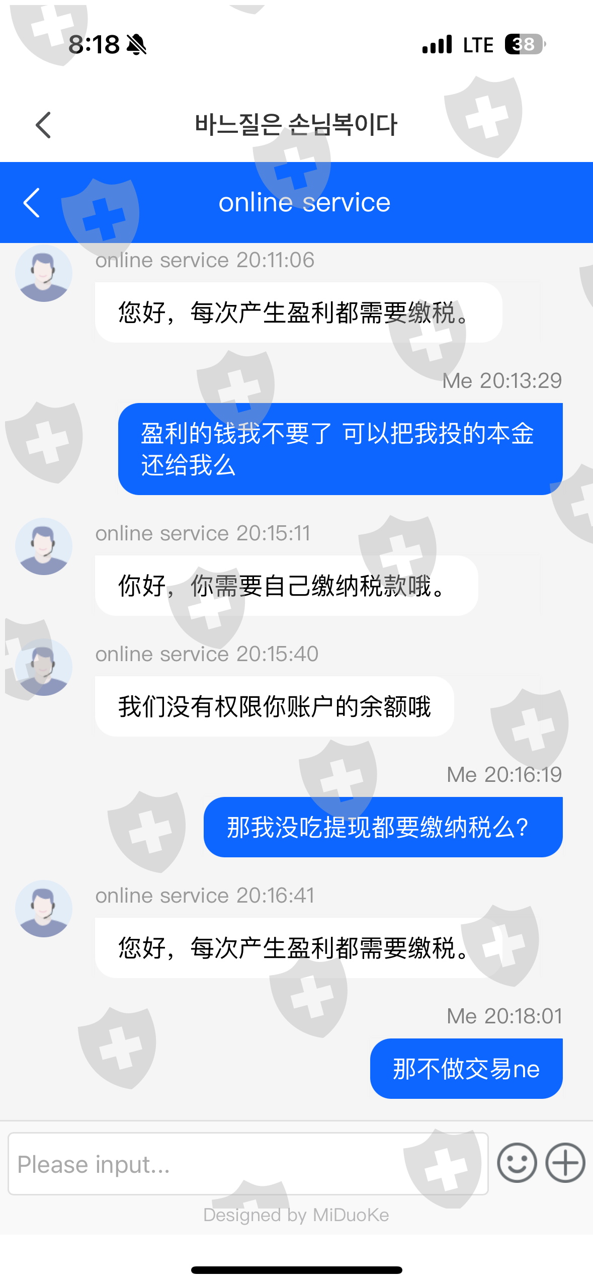 我经朋友介绍 在App Store下载了交易平台软件 对方说要带我一起赚钱 起初建议我只投资200韩币 之后又让我投资两千万韩币 我觉得不靠谱 想把200万取出 可是 客服告诉我 出金要交一次保证金 我交了 交了 开始那个人说行情好带我交易 我交易了 然后也赚了 之后我还是想把本金取出 客服各种百般阻拦啊 说大额出金必须开通大额出金通道 让我交交通平台的百分百 当时我只想把我的钱取出 就交了 我以为交了就能出金 然后认识的那个人开始带我做交易 每次都能赚 后来交易平台美元越来越多 最后出金根本不可能了 又让我缴纳税 我也交了 交完还是不让出金 为了 提走两百万韩币我损失两千万 这个钱 我能讨个说法么?