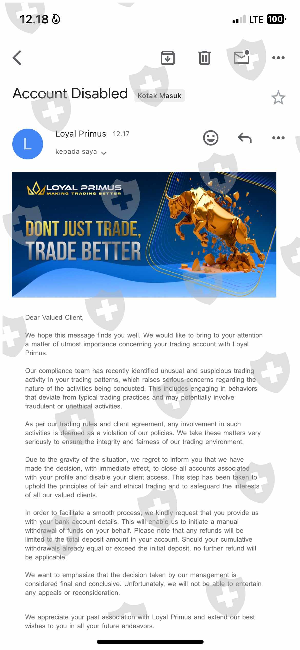 I traded at this broker with a deposit of 307$. Immediately after that I just traded normally. My trading was in the Xauusd pair with a layering lot of 0.03 with 10 layers. I sold in the 2420 area and I closed at around 2395, making a profit of around $875. Immediately the next day after making the payment details I withdrew all my money amounting to $1182.30 but immediately after that my account was disabled by LoyalPrimus. I hereby hope for the good faith of the LoyalPrimus broker to immediately pay all my withdrawals.