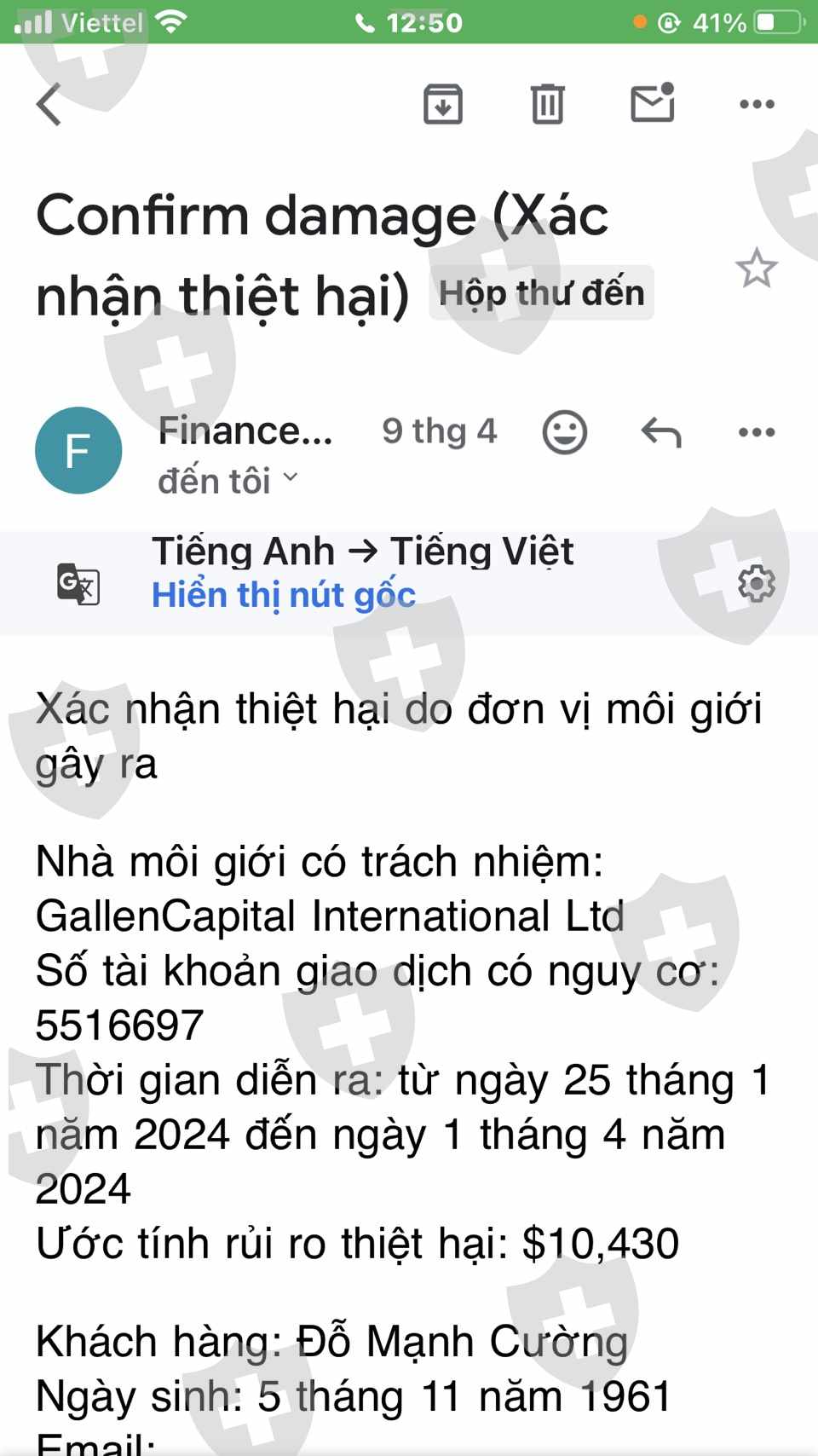 tôi có giao dịch tại sàn gallen capital với id 5516697 . trong quá trình giao dịch tôi có nạp tổng cộng 11 ngàn đô. Sau 1 thời gian giao dịch tôi đặt lệnh rút tiền thì không rút được , hỏi sàn thì bảo là do giao dịch chưa đủ ký quỹ , tôi tiếp tục giao dịch một thời gian nữa vẫn không rút được , với lý do giao dịch chưa đủ ký quỹ , sau đó sàn cho nhân viên hỗ trợ của sàn hướng dẫn tôi giao dịch những mã của sàn gợi ý mã wheat.g sau đó tôi vào giao dịch 0,5 lot của mã đó và bị cháy tài khoản luôn , Tôi muốn tố cáo sàn này là 1 sàn lừa đảo để chiếm đoạt tiền của khách hàng . Chủ mưu là thằng Khánh là quản lý quỹ của sàn đã gợi ý cho khách giao dịch mã Wheat.g và chỉnh giá để làm cháy tài khoản của khách , số dt của nó là : 076-2258504 , Sau khi tôi đăng bài viết tố cáo sàn lên Wikifx thì nhận được thư trả lời của quỹ dự phòng MetaQuotestLTD , nhưng đến nay tôi vẫn chưa nhận lại dược số tiền . tôi gửi kèm hình ảnh ở dưới đây . Mọi người đừng giao dịch tại sàn này nhé !