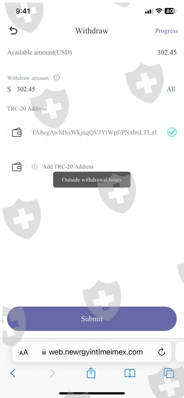 Intento sacar mi dinero, pero la plataforma me arroja un mensaje que "Outside withdrawal hours" Y la coordinadora de Newrgy comenta que no podemos sacar nuestro dinero hasta después del 16 de agosto del año en curso debido a que Newrgy se encuentra en auditoría.