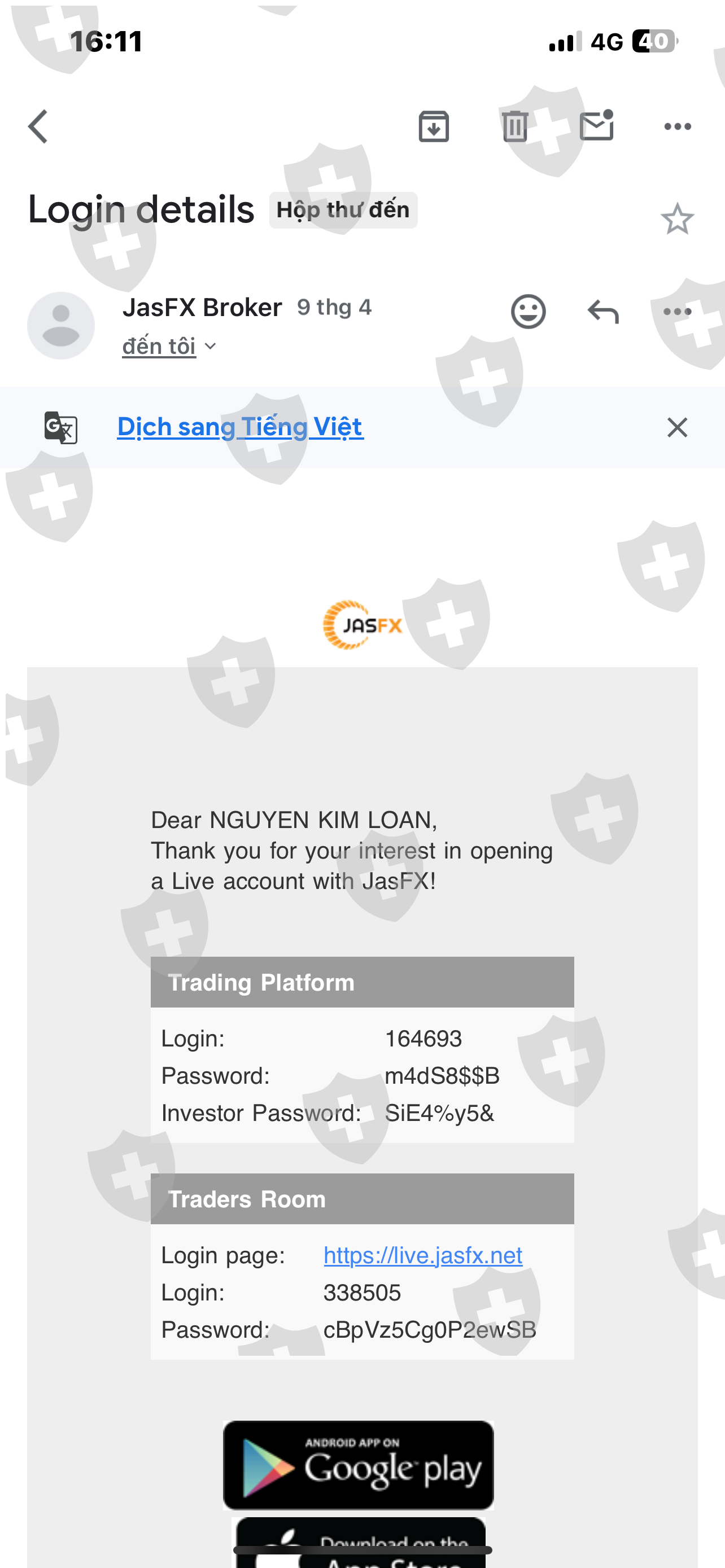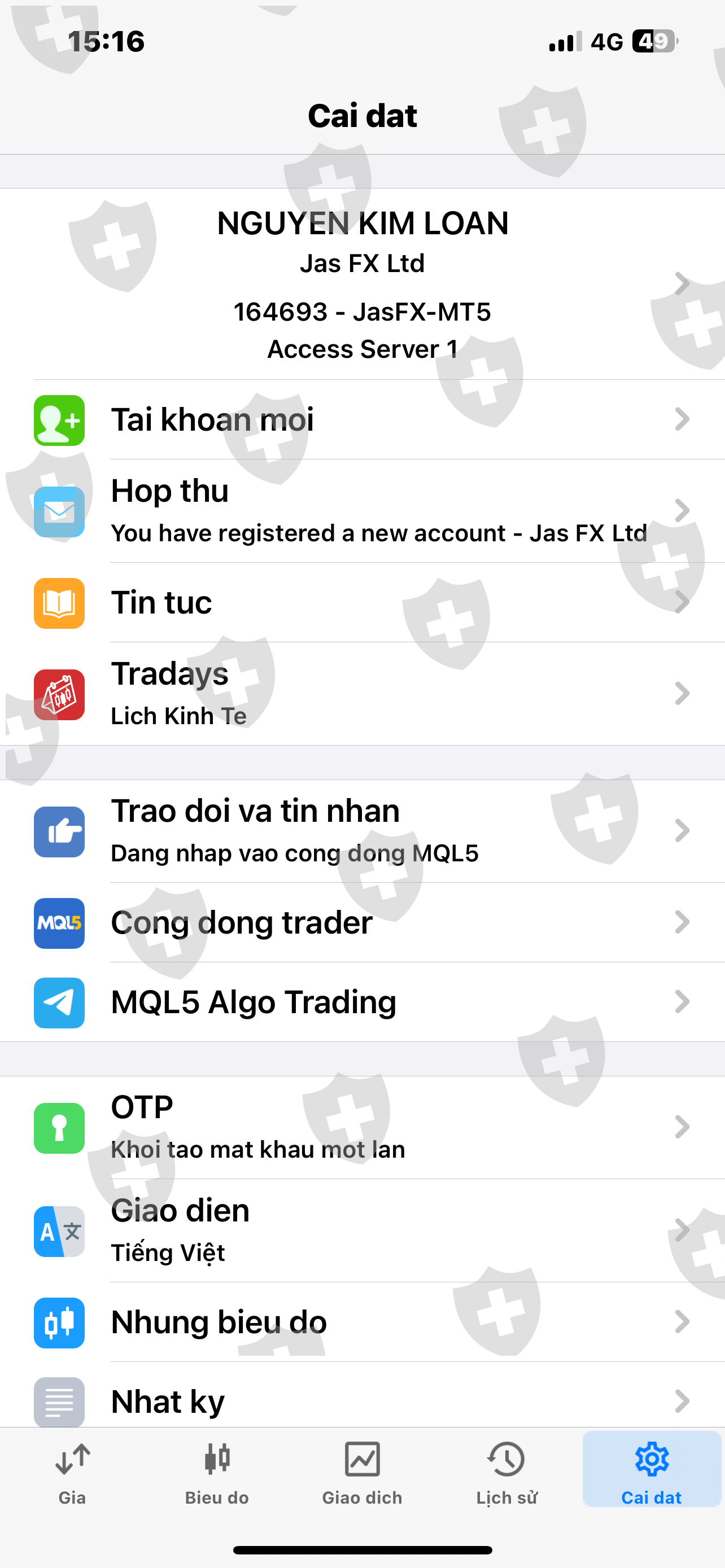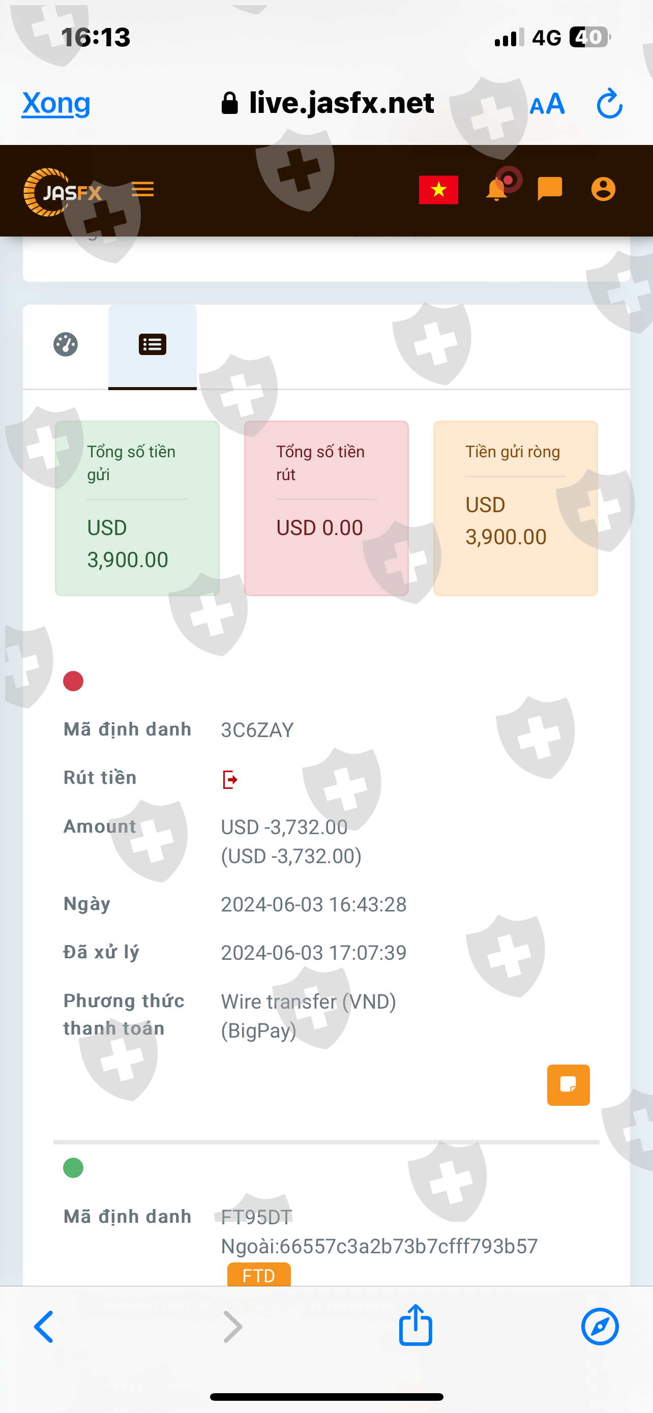 Tôi là chỉ tài khoản MT5: 164693 là khách hàng giao dịch của sàn JasFX. tôi có đầu tư vào sàn theo lời mời đầu tư của nhân viên tư vấn tên là: NGUYỄN NHẬT QUANG tôi đã vào số vốn là 3.900$ vào và được nhân viên kỹ thuật của sàn có tên là TRỌNG TÍN(telegram) và được người này hỗ trợ mua cổ phiếu nhận cổ tức và giao dịch vàng . nhưng khi nhận cổ tức giá cổ phiếu tụt tôi muốn giữ vốn lại và đã cắt âm lệnh tôi còn lại số vốn 3.732 usd tôi muốn rút tiền ra giải quyết việc rồi vào lại sau và tôi có báo tư vấn và kỹ thuật của sàn là như vậy. khi có Mail gửi về là lệnh rút tiền đã được chấp thuận tôi chờ 24h,48h không thấy tiền về và dần đến tuần sau cũng không thấy tiền về báo tư vấn và kỹ thuật không nghe máy gọi điện số tổng đài của sàn 1900099970 thì bảo để e kiểm tra. sau đó kỹ thuật của sàn hướng dẫn tôi đi lệnh COTTON.std và tài khoản tôi cháy không còn tiền vậy là tôi không rút được tiền. nhân viên của sàn làm ăn vớ vẩn tôi viết bài viết này lên mong mọi người cảnh giác xin cảm ơn