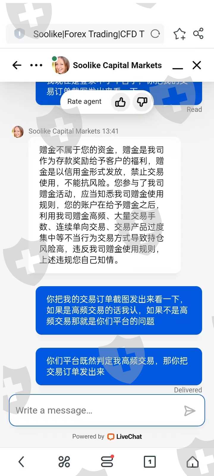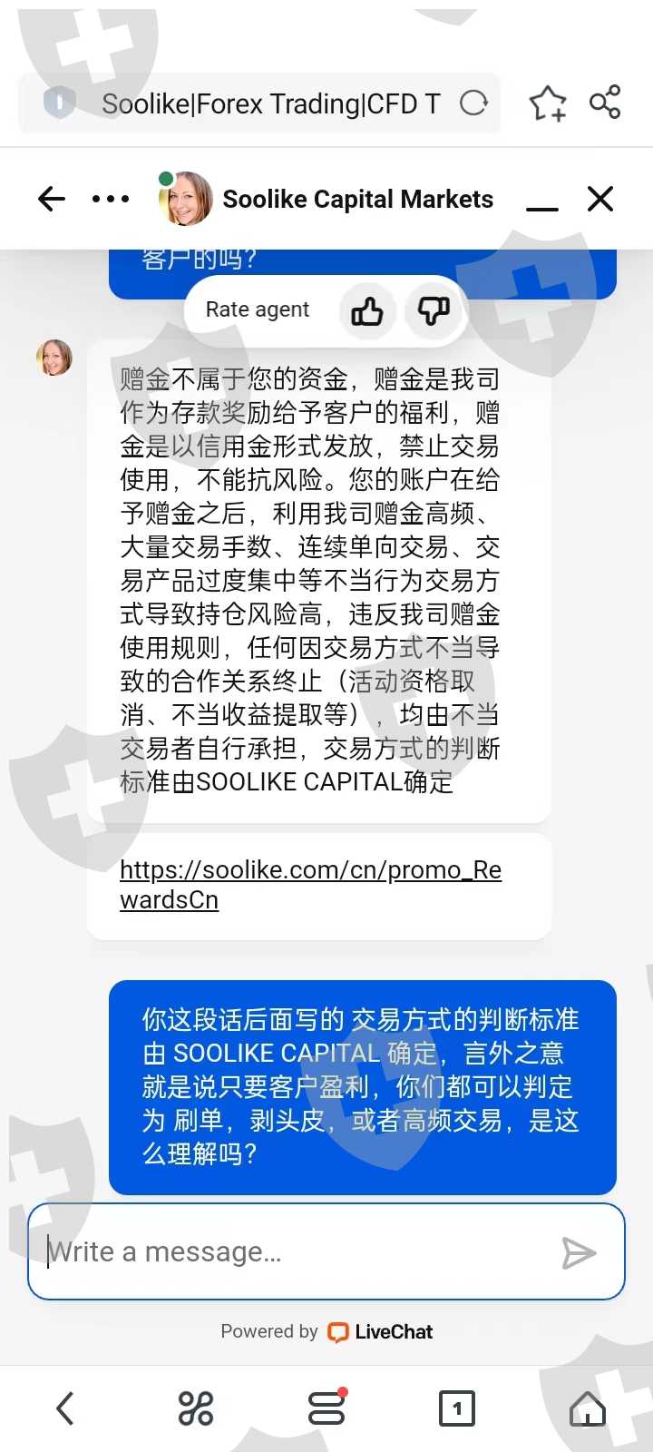 你封我账号可以,关键你这个高频交易,我真的是无法接受。既然平台耍无赖,那我就直接出金,被平台告知我只能出本金,盈利不给出。还说客户的交易类型是由平台来判定(见附图),言外之意就是说平台判定你高频,你就是高频,不是高频也是高频,所以,盈利不给出。在跟平台客服持续沟通的过程中,也是只有一句话,平台判定的就是高频,你就高频。玩不起就不要玩。