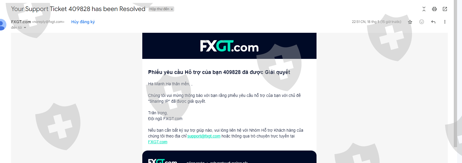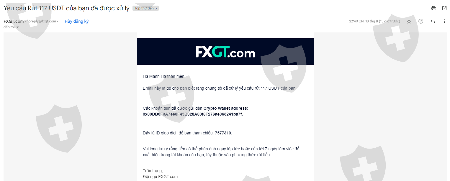 Xin chào . Tôi là Mạnh Hà Trader đến từ Việt Nam . Vào ngày 16/8/2024 tôi có đăng ký tài khoản bên FXGT và nhận bonus 30% để giao dịch. Sau khi đã có tổng lợi nhuận là 611 USDT và tôi đã đặt lệnh rút tiền. Sau đó vào ngày 17/8/2024 sàn đã từ chối lệnh rút tiền của tôi và tiếp theo sàn đã xóa -494.18185476 USDT của tôi để lại cho tôi 117 USDT . . Tiếp theo gửi cho tôi mail gian lận sử dụng đăng ký 2 gmail. Tôi xin cam đoan đó hoàn toàn là thông tin không đúng sự thật . Tôi giao dịch chỉ sử dụng wifi tại nhà riêng và mạng 4G.
