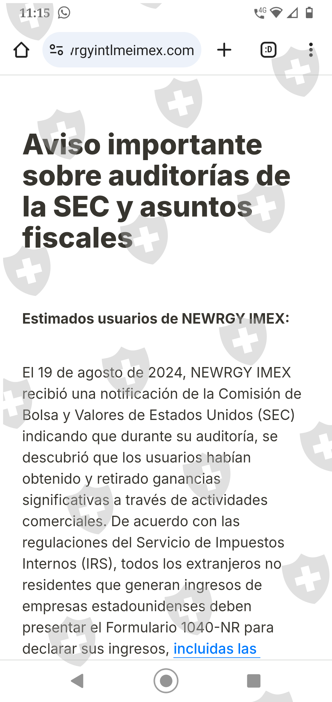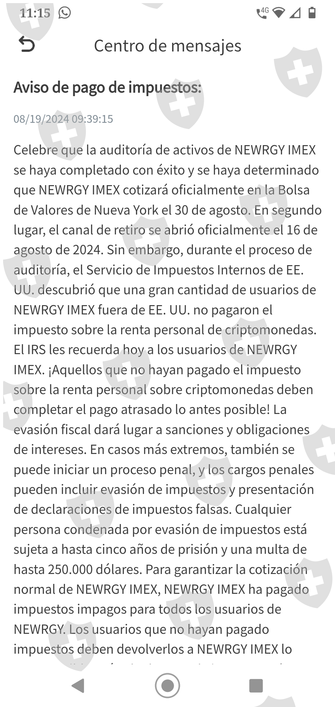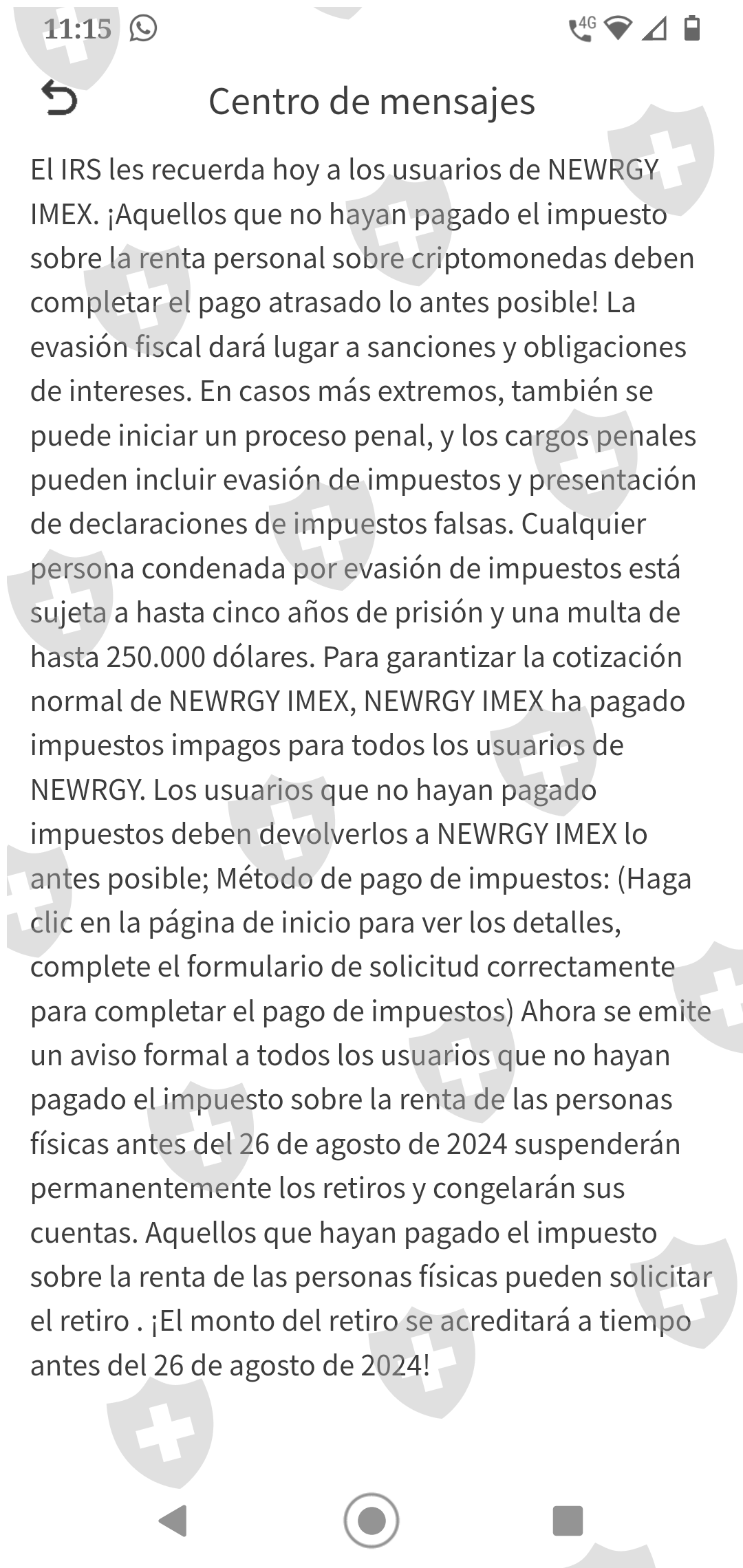 El día de hoy 19 de agosto Newrgy ha solicitado el pago de un impuesto para poder realizar un retiro. En caso de no hacerlo se congelará la cuenta. Solicita llenar un formulario para el pago del mismo. Necesitamos de su ayuda para recuperar nuestros fondos