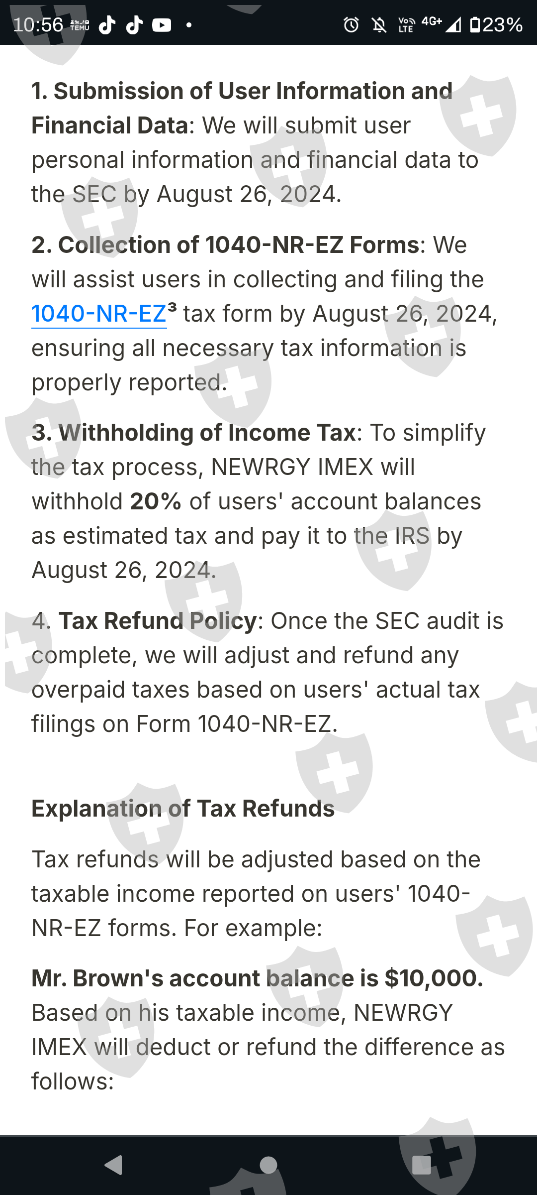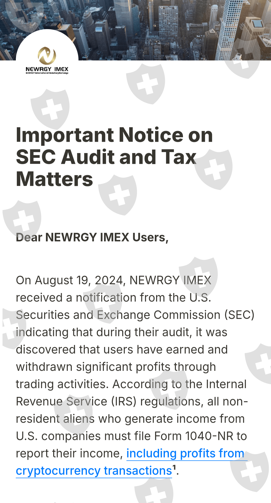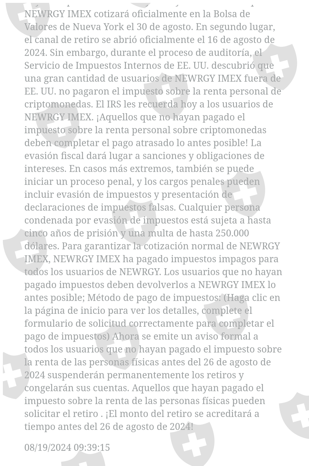 Newrgy 不要求支付 20% 的“税款”押金,以解除 8 月 16 日提交的提款请求,声称这是为了向美国国税局缴税。这阻止了我们提款,而且他们还威胁说,如果在 8 月 26 日之前不完成,我们的账户将被永久冻结,无法再提取任何资金。请帮助采取行动。