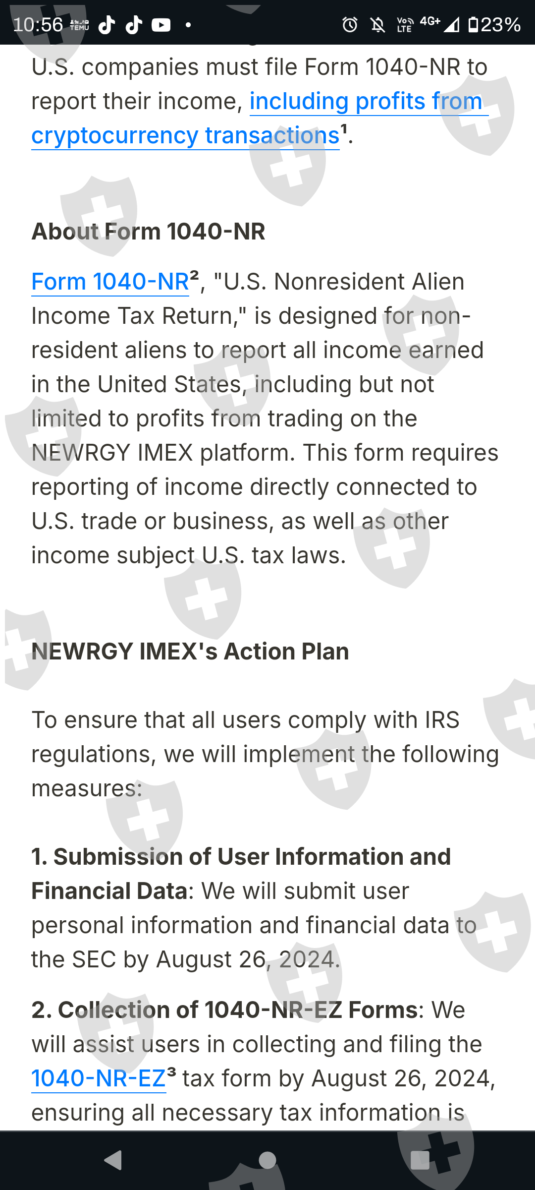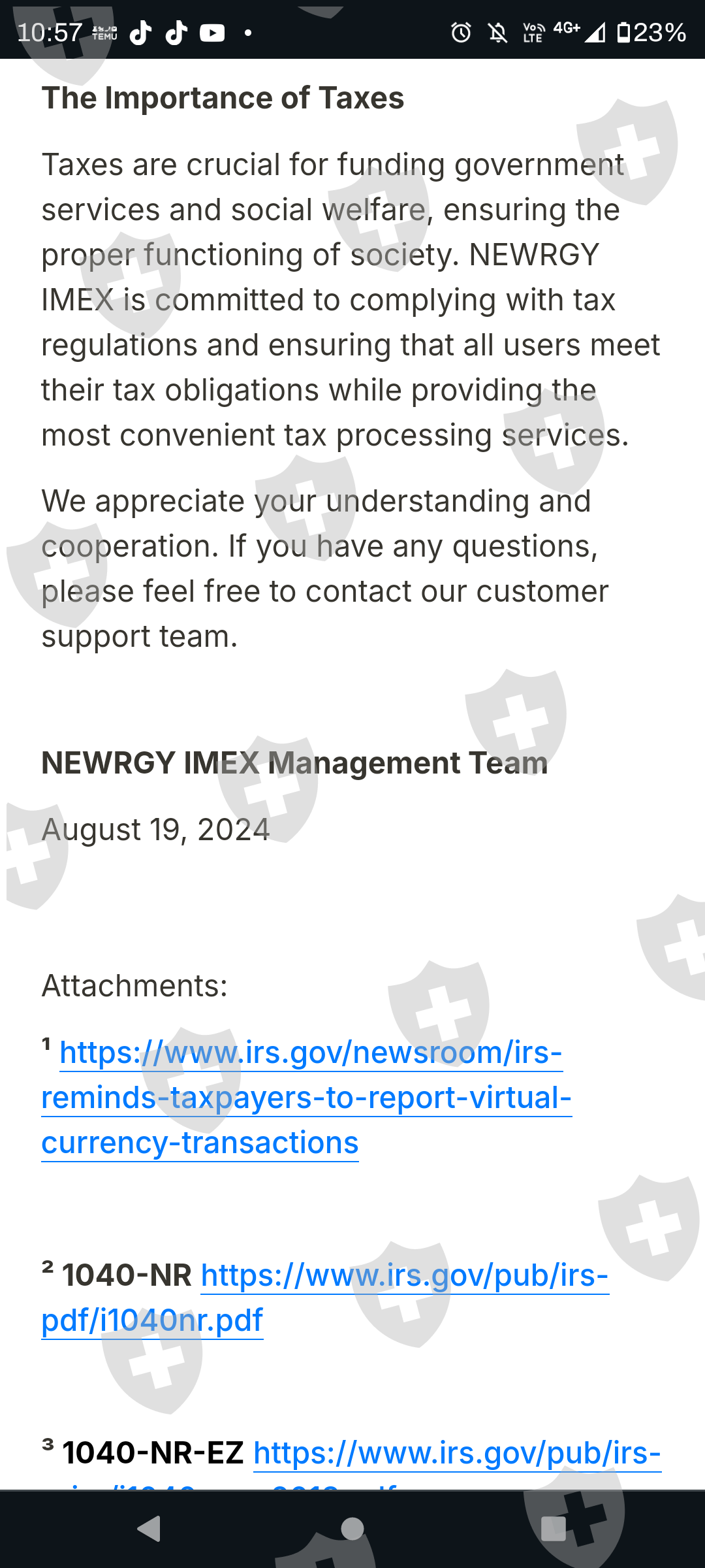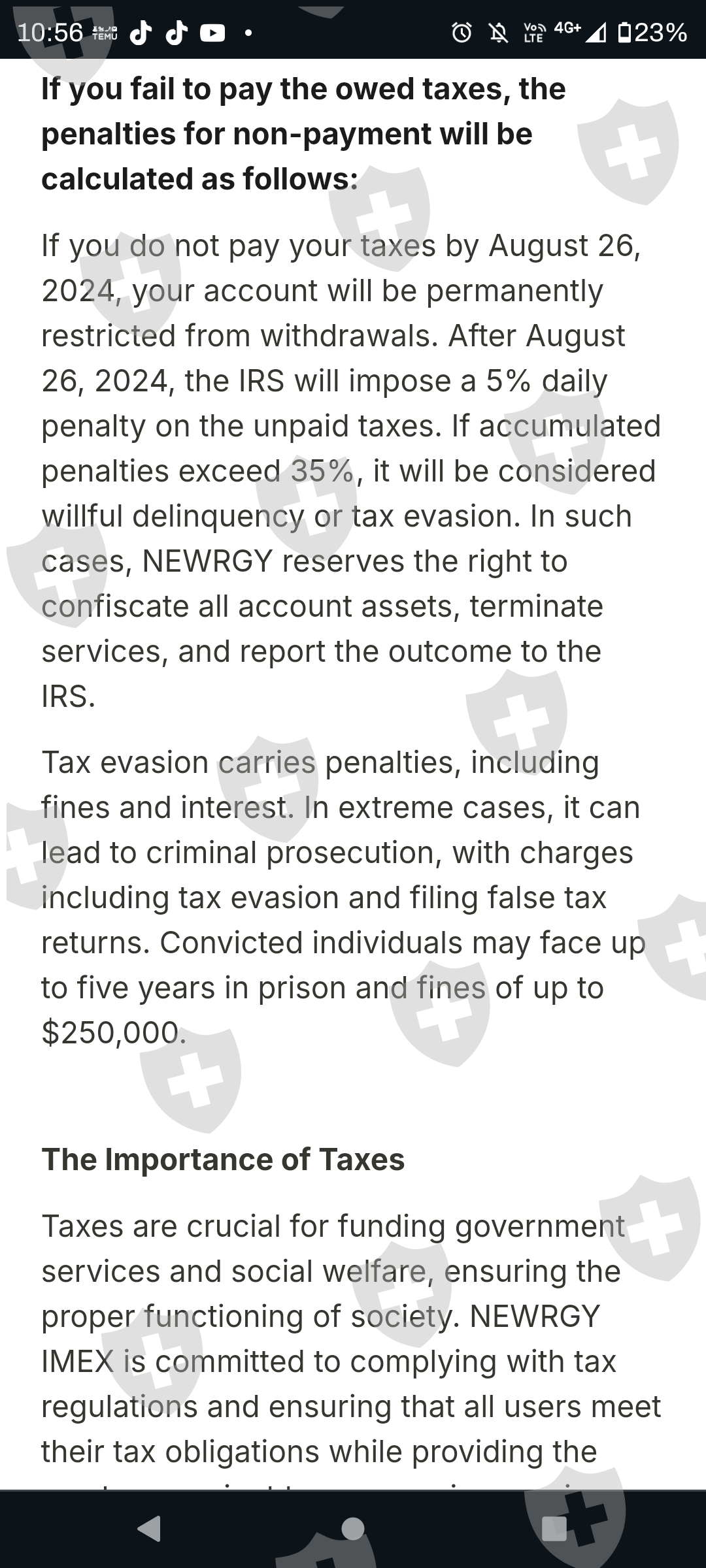 Newrgy 不要求支付 20% 的“税款”押金,以解除 8 月 16 日提交的提款请求,声称这是为了向美国国税局缴税。这阻止了我们提款,而且他们还威胁说,如果在 8 月 26 日之前不完成,我们的账户将被永久冻结,无法再提取任何资金。请帮助采取行动。