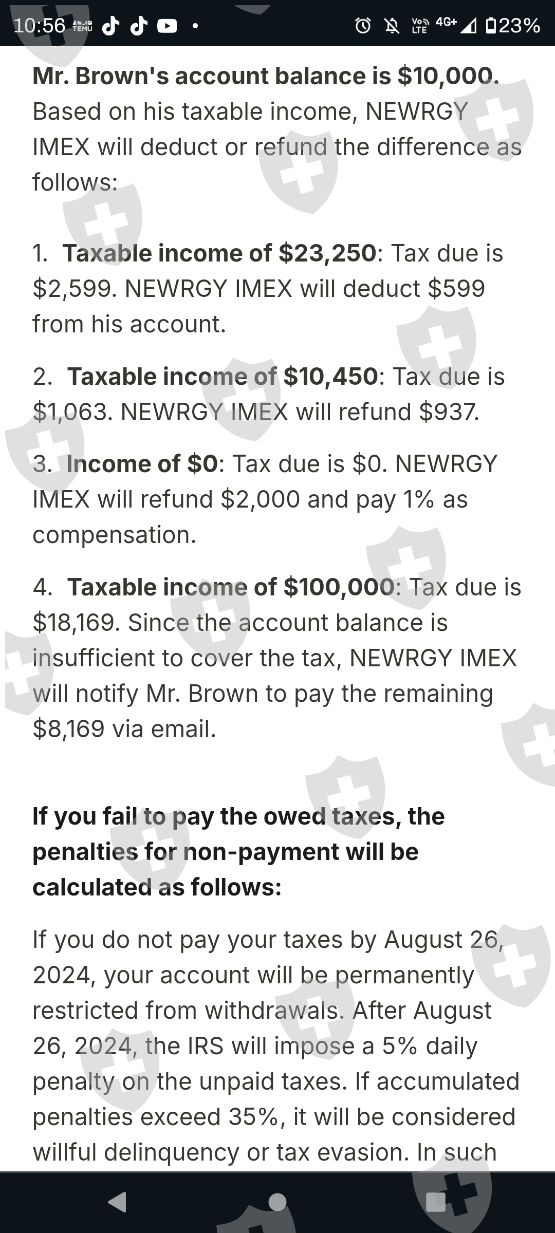 Newrgy is no asking for a 20% "Tax" deposit in order to release the withdrawal requests submitted on August 16th claiming it is to pay IRS in the US. This is preventing us from withdrawing and furthermore they are threatening that if not done by August 26th our accounts will be permanently frozen from withdrawing any more money. Please help in taking action.