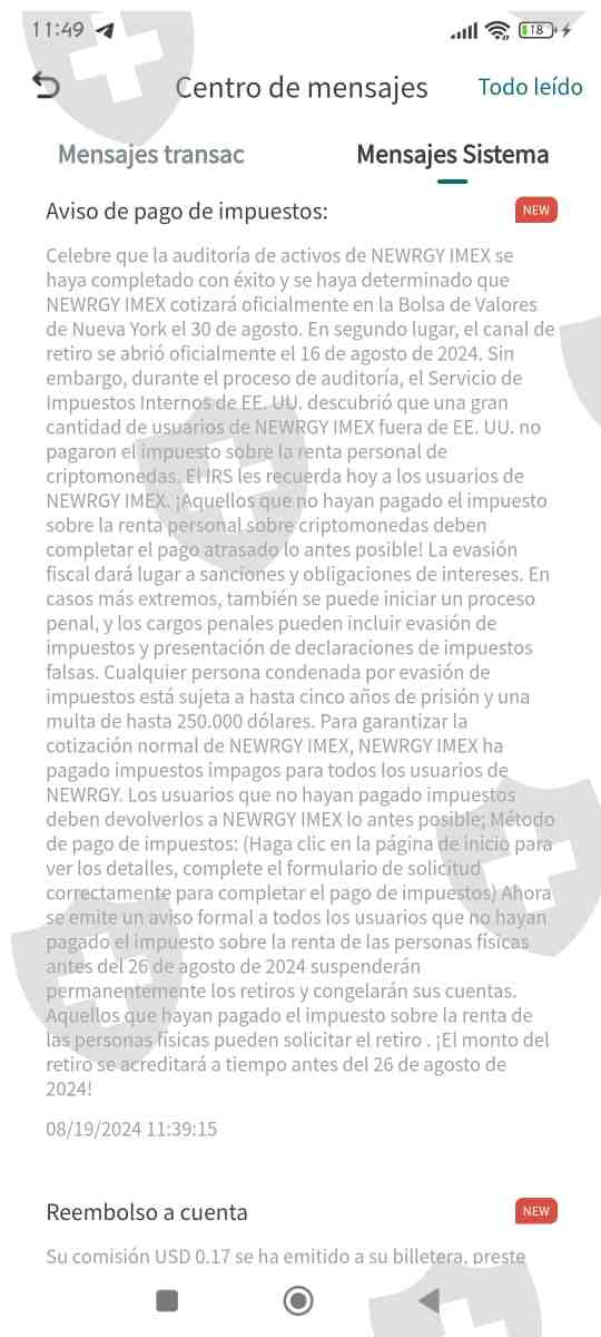 El día de hoy esperaba mi retiro junto con otras 200 o más personas, sin embargo nunca llegó, solo llegó una notificación en la cual nos decía que NEWRGY pago nuestros impuestos por adelantado y que para poder retirar es necesario pagar el 20% de impuestos de lo contrario podemos perder la cuenta (que ya es lo de menos) perder el dinero, además de amenaza de cárcel y una multa de $250,000 dls. por favor ayuda