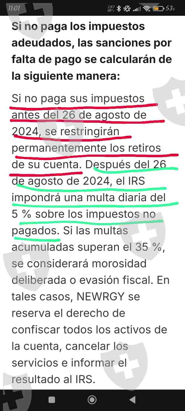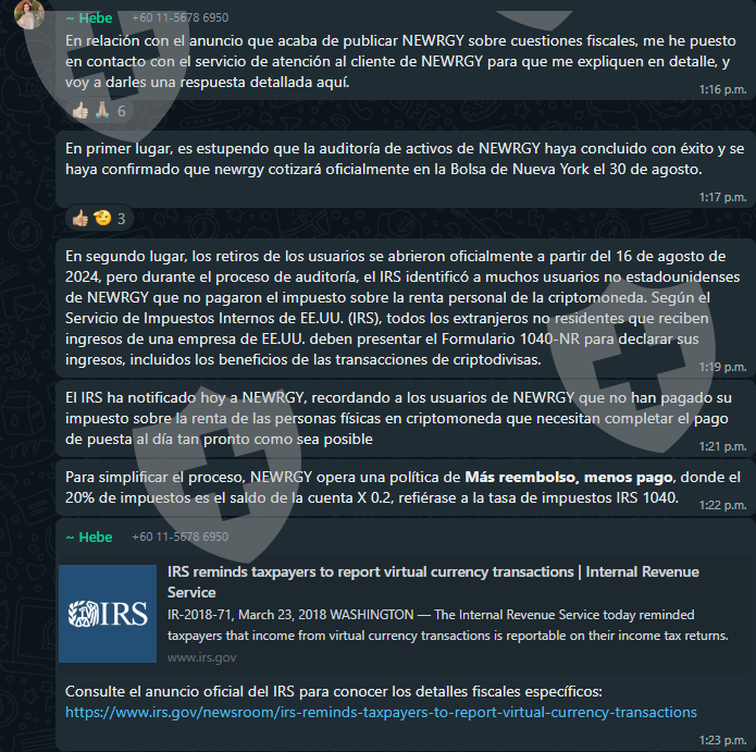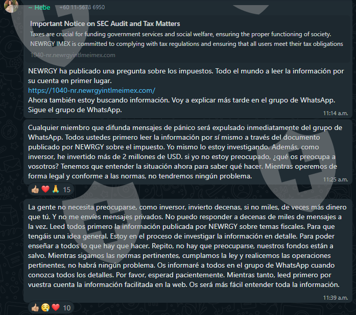 我谴责 NEWRGY IMEX以防可能的欺诈行为。两周以来,我的提款一直以纽约证券交易所上市审计为借口被阻止。原本承诺8月16日解锁,但由于周末未能实现。如今,提款时需要缴纳 20% 的税,逾期付款则需每天额外缴纳 5% 的税。此外,我还收到了有关该主题的假新闻链接:https://asialogue.com/news/newrgy-imex-to-go-public-in-the-us/483131 https://theupstocker.com/news/ newrgy- imex-to-go-public-in-the-us/483131 https://nextnewtech.com/news/newrgy-imex-to-go-public-in-the-us/483131 与用户进行通信名叫hebe(+60 1156786950)。我请求紧急调查。