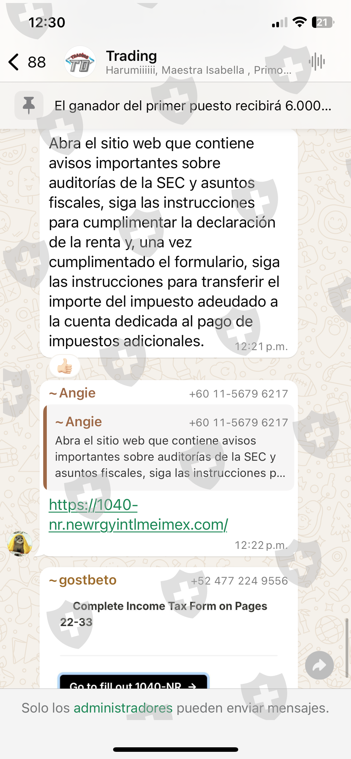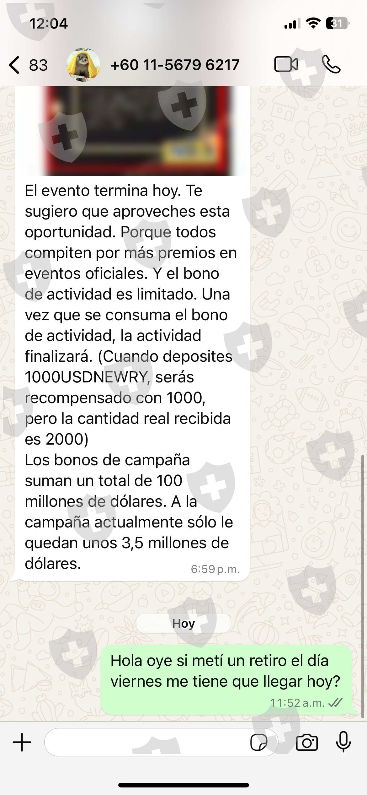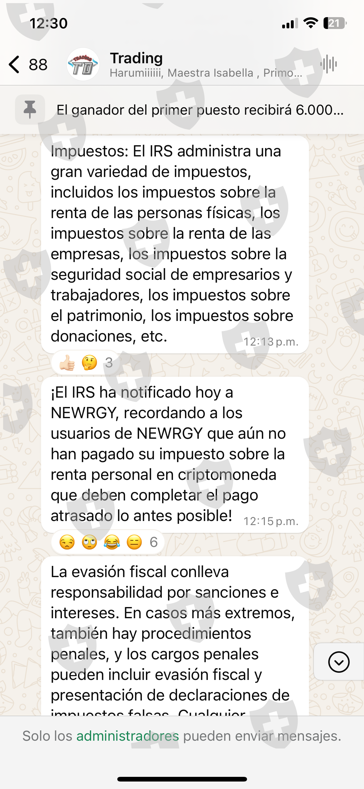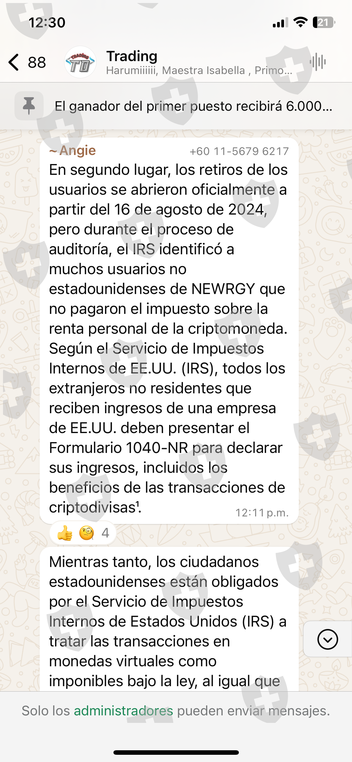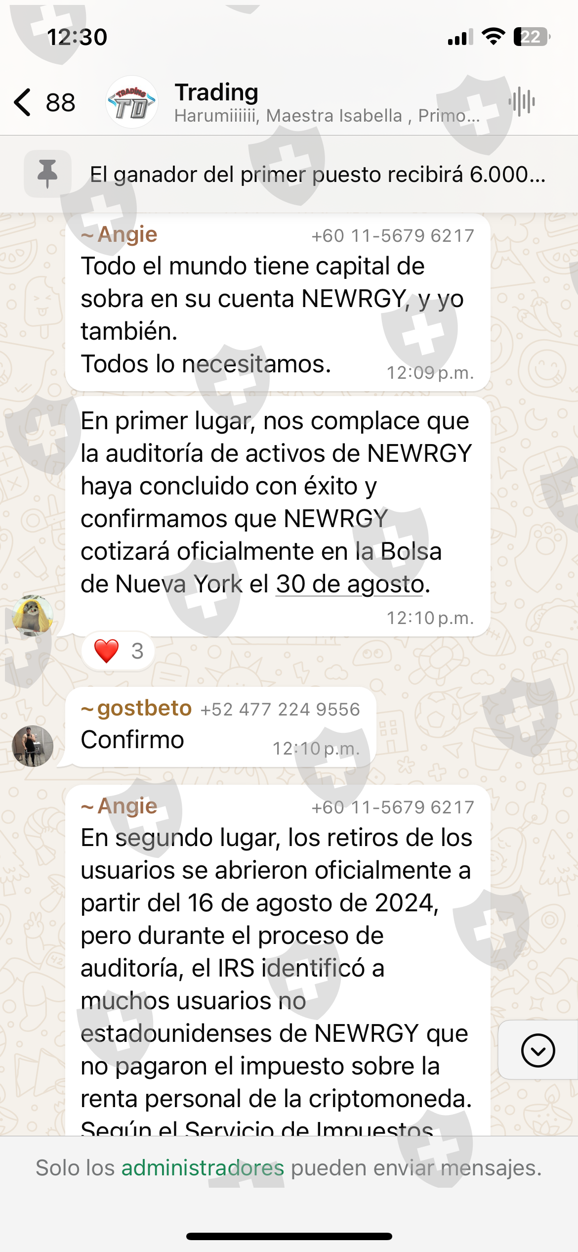 NEWRGY IMEX据报道,该公司据称致力于在股票市场上买卖股票,但这只是一个骗局,其他用户邀请您参与以赚取更多钱,并且在几周内他们不允许您提取资金他们给你提款100%的奖励,也就是说,你存了100美元,他们又给了你100美元。资金不能提取,这只是一个谎言,今天,8月19日,他们要求存入20美元你总资金的百分之几才能让你提现,请不要上当!!