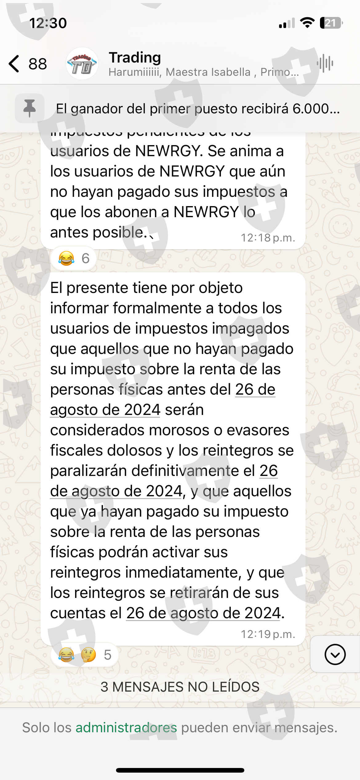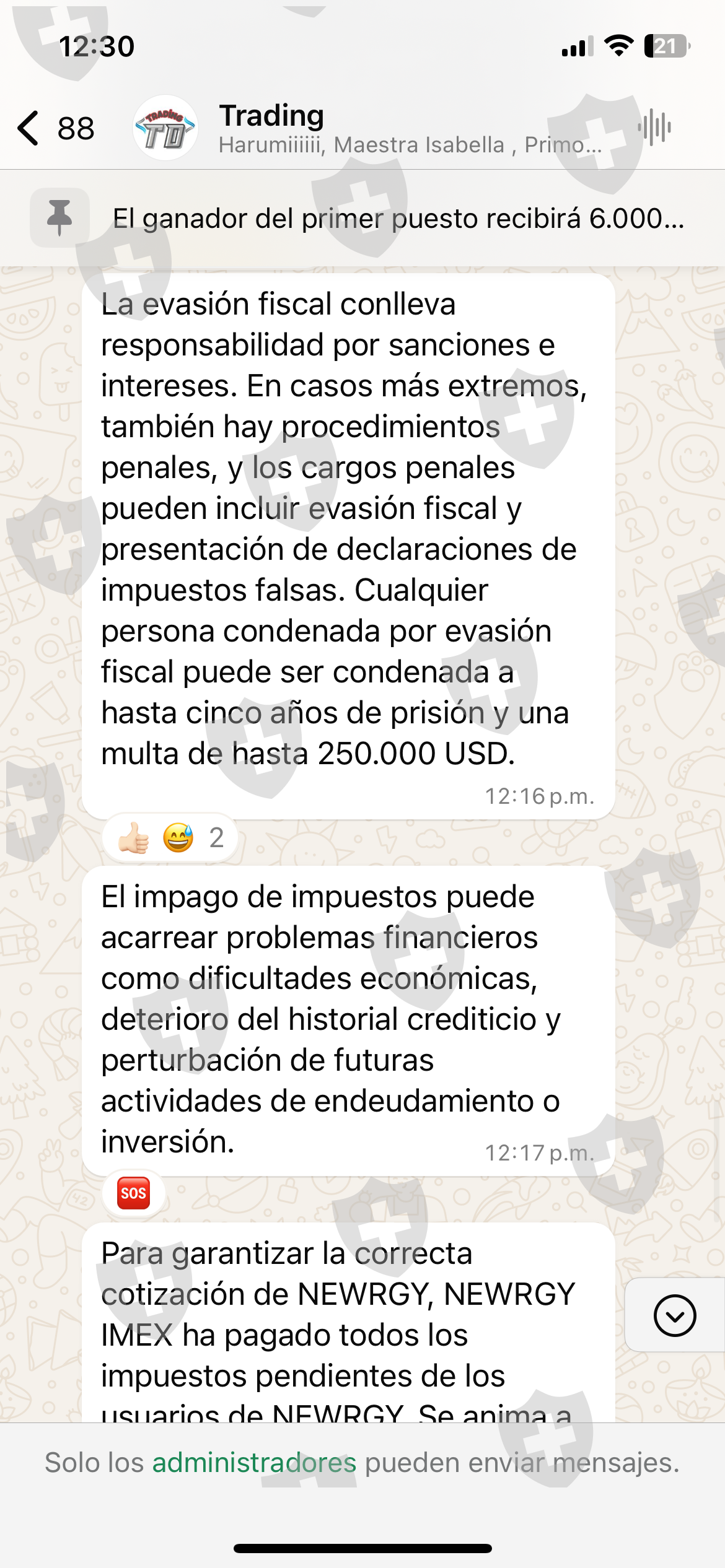 NEWRGY IMEX empresa supuestamente dedicada a la compra y venta de acciones en la bolsa, solo es una estafa otros usuarios te invitan a participar para así ganar más dinero y desde hace un par de semanas no dejan retirar el dinero, según estaban dando el 100 por ciento de recompensa por tu retiro es decir depositabas 100 usd te daban ellos otros 100. Fondos que no se pueden retirar, solo es una mentira y hoy 19 de agosto están pidiendo depositar el 20 por ciento de tus fondos totales para poderte dejar retirar porfavor no caigan es fraude!!