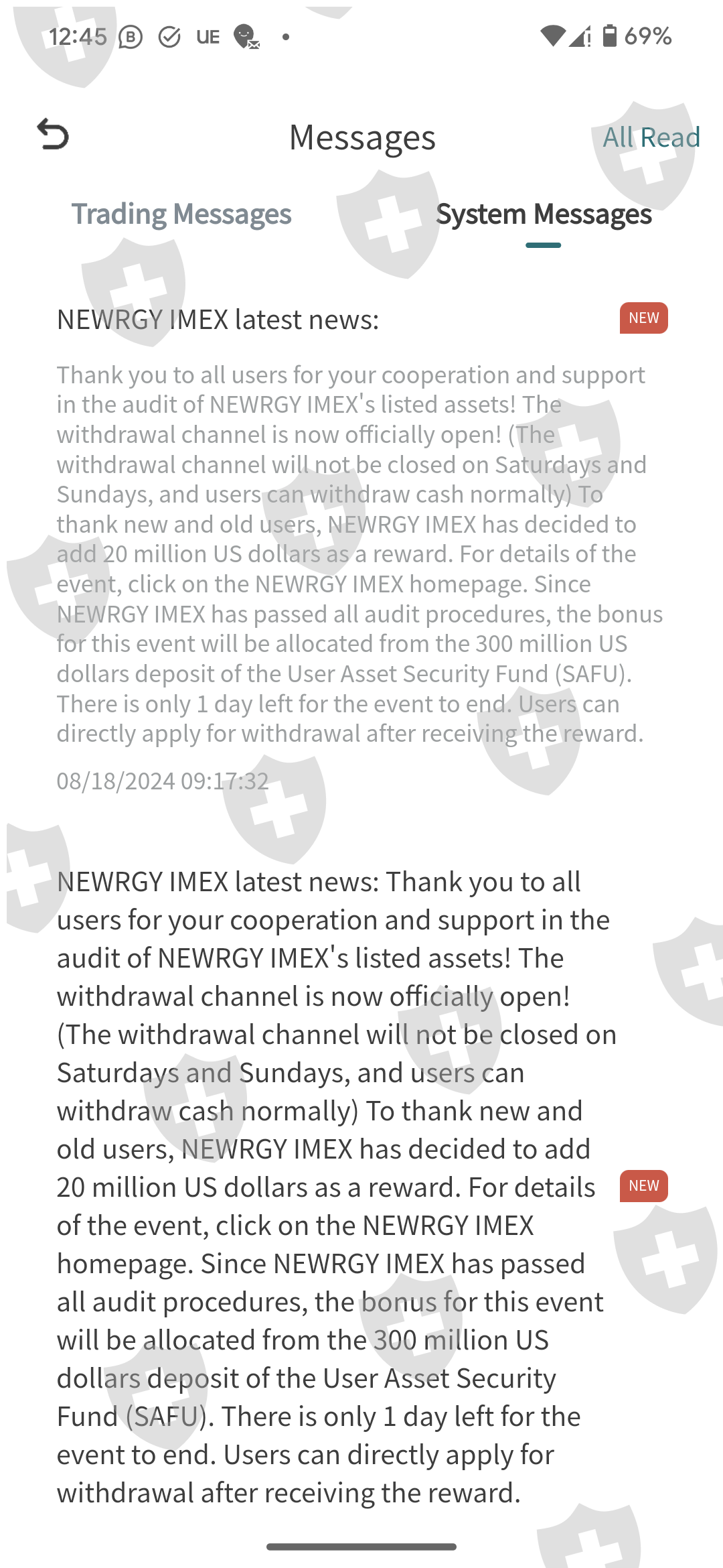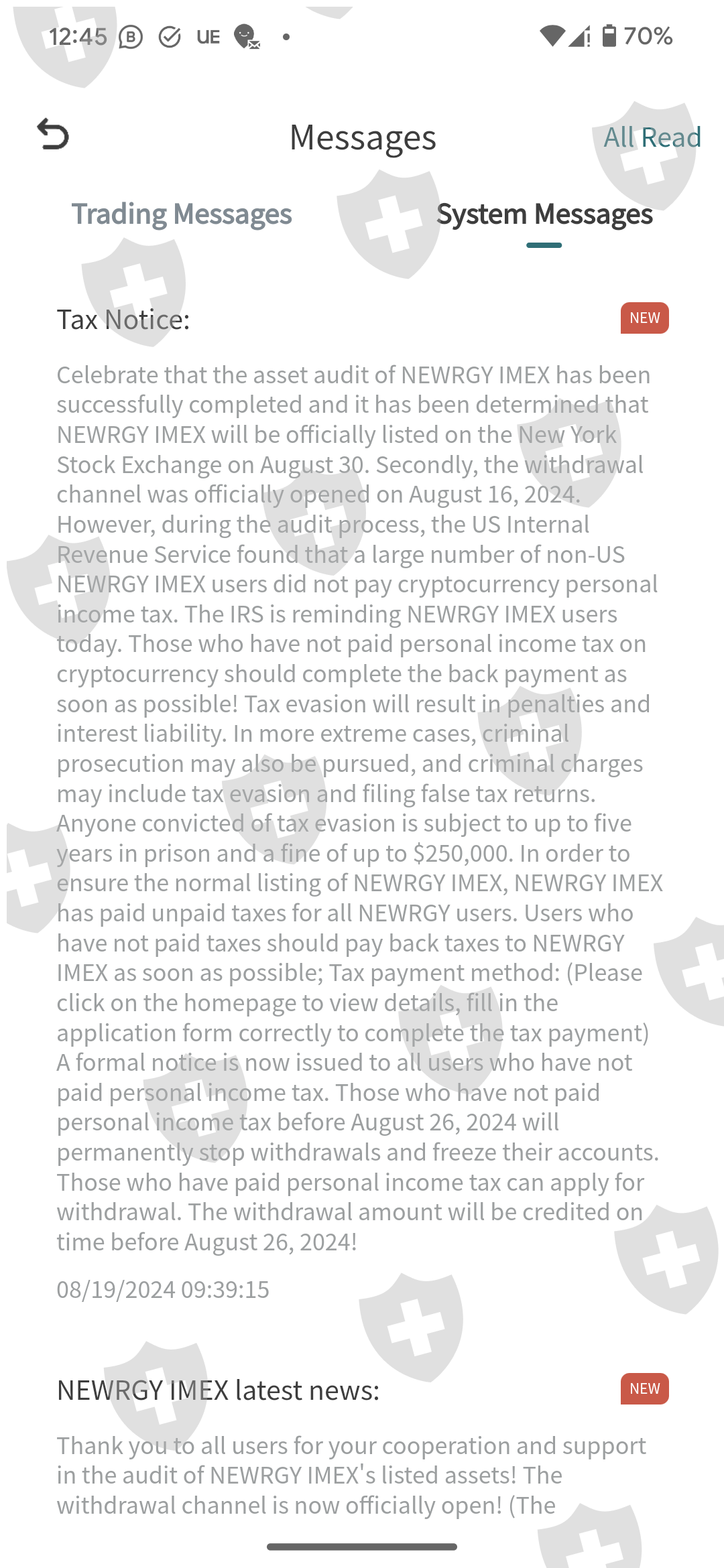 NEWRGY IMEX:我写信是为了正式报告关于 NEWRGY IMEX,我怀疑参与了欺诈活动。我一直是这家公司的客户,不幸的是,我现在面临着一个引起严重警觉的情况。最近,我存入了资金 NEWRGY IMEX:,但这些资金一直处于冻结状态,没有任何明确的解释。尽管我多次尝试解决这个问题,但该公司现在要求我额外存入我当前持有量的20%才能释放冻结的资金。他们还发出警告,如果在一周内不遵守这一要求,将导致我的所有资产被永久冻结。他们接受了我的提款请求,随后又拒绝了。这种情况似乎是一种胁迫和欺诈手段,旨在以虚假的借口榨取更多的钱。我深感担忧,并感谢任何在这方面的帮助。提前致谢。