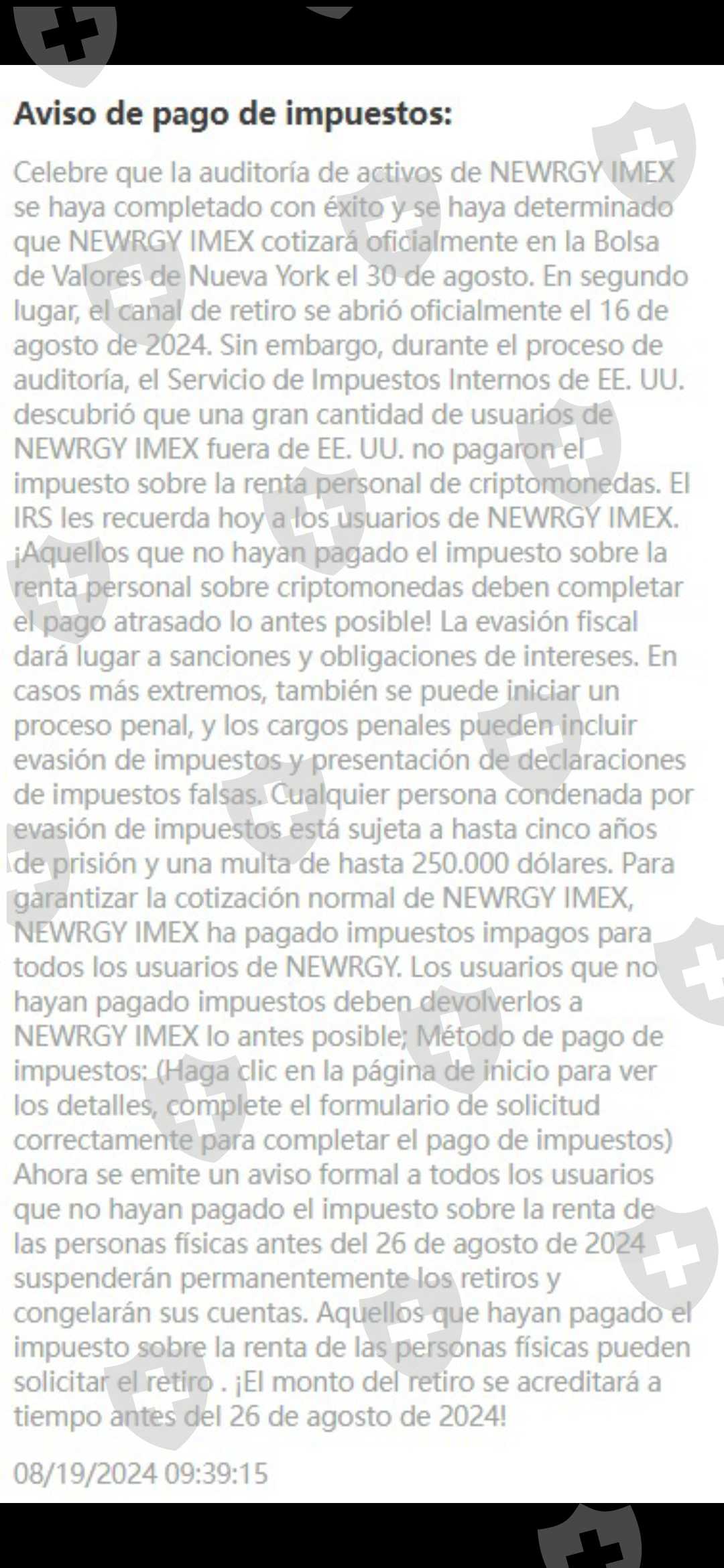 Los primeros meses dejaba retirar sin ningún problema por lo que seguí invirtiendo dinero, aproximadamente hace 15 días solicité un retiro de efectivo y me lo negaron argumentando que la plataforma se encontraba cotizando para trabajar en la bolsa de valores de new York, y que se podía retirar apartir del día 16 de agosto de nueva cuenta solicite el retiro y me lo vuelven a negar ahora que por qué hay que pagar un impuesto de Isr del 20 % basado en el capital que tenemos en la cuenta eso no se me hace justo ya que mediante la información brindada nunca nos dijeron esa parte.