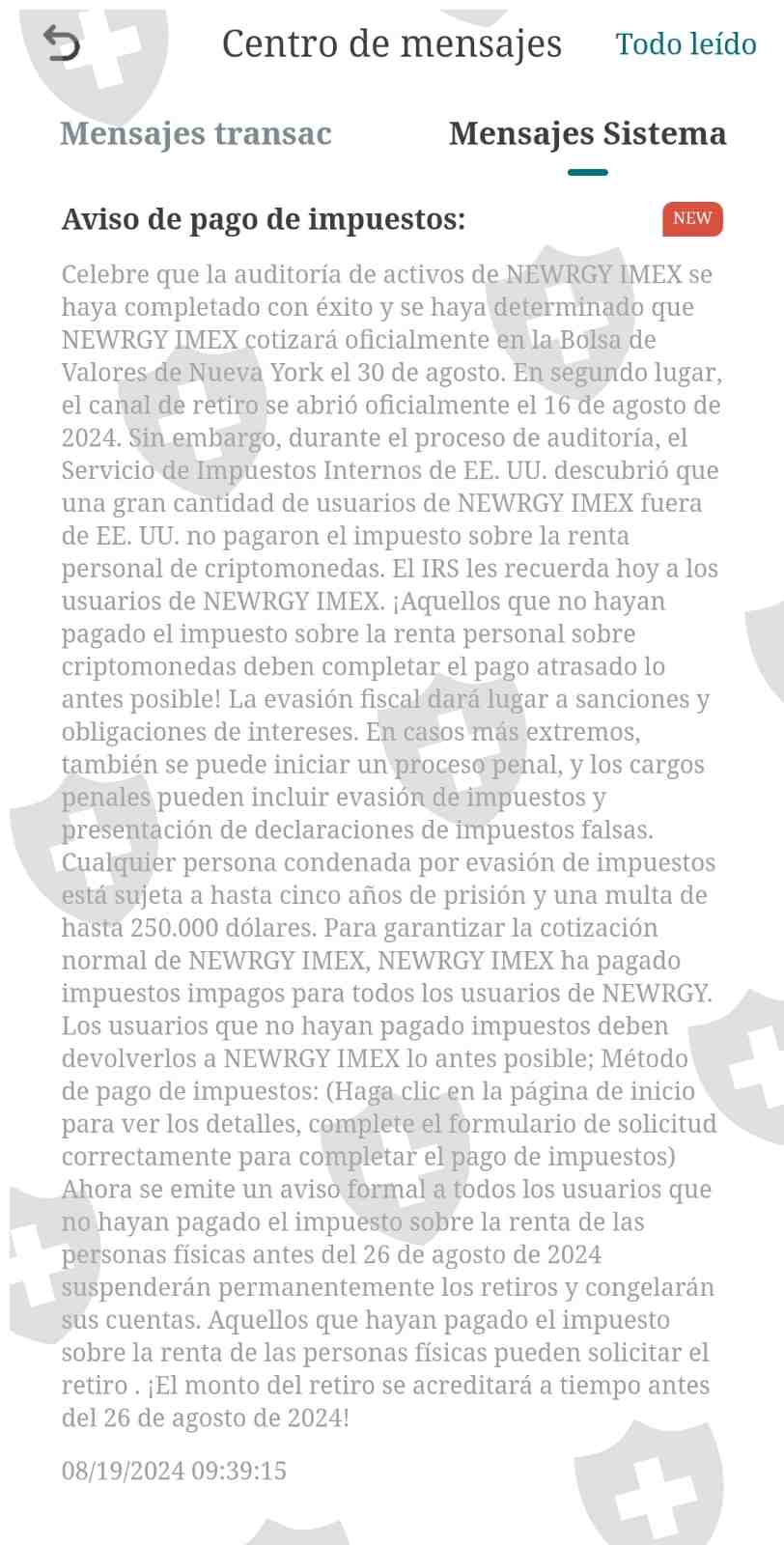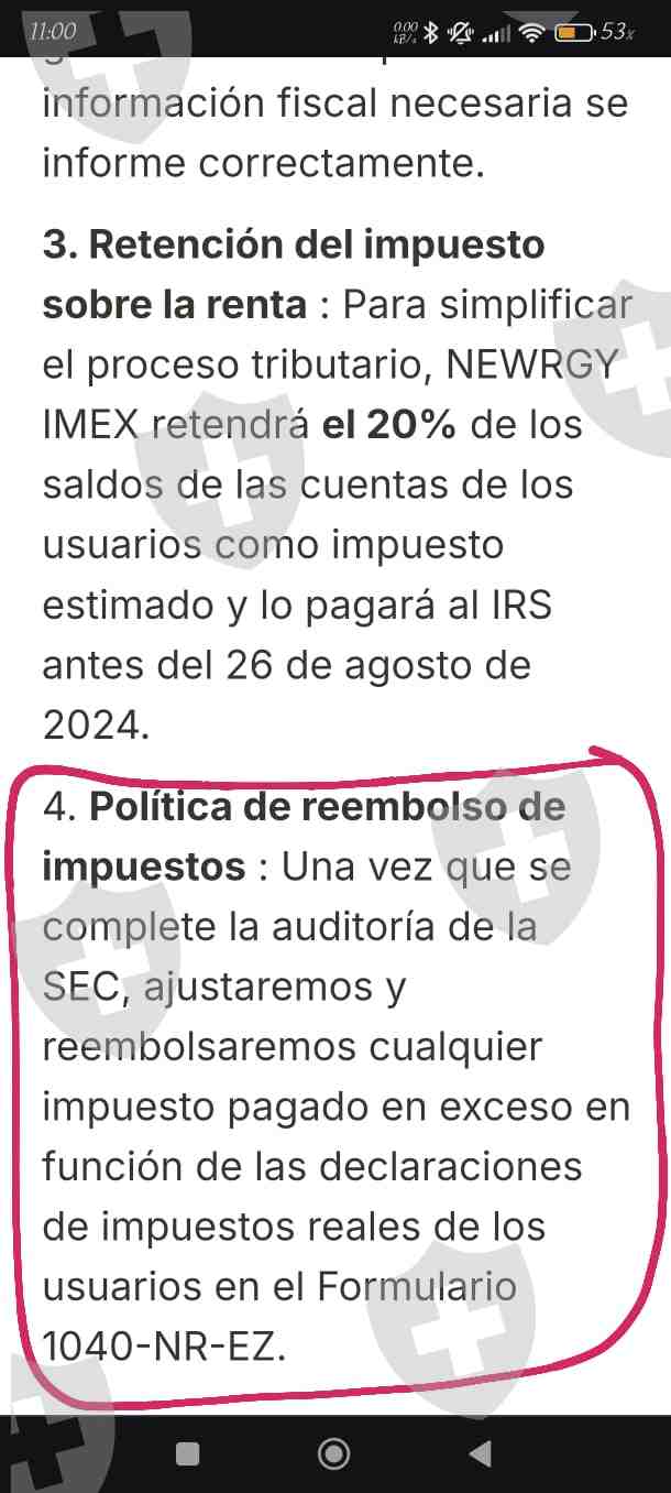 La App de Newrgy no deja retirar mis ganancias y tengo que pagar los impuestos, estoy perdiendo mi inversión, es una estafa no genera ganancias