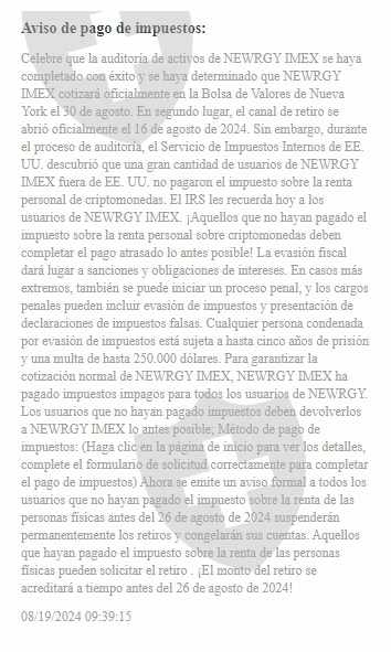 Esperé a la fecha del 16 de agosto para poder retirar dinero y todo había ido normal. Hice mi solicitud el día 16 de agosto a la media noche. Hoy lunes 19 de agosto, la plataforma dice que tenemos que pagar impuestos para poder retirar, cosa que nunca había sucedido.