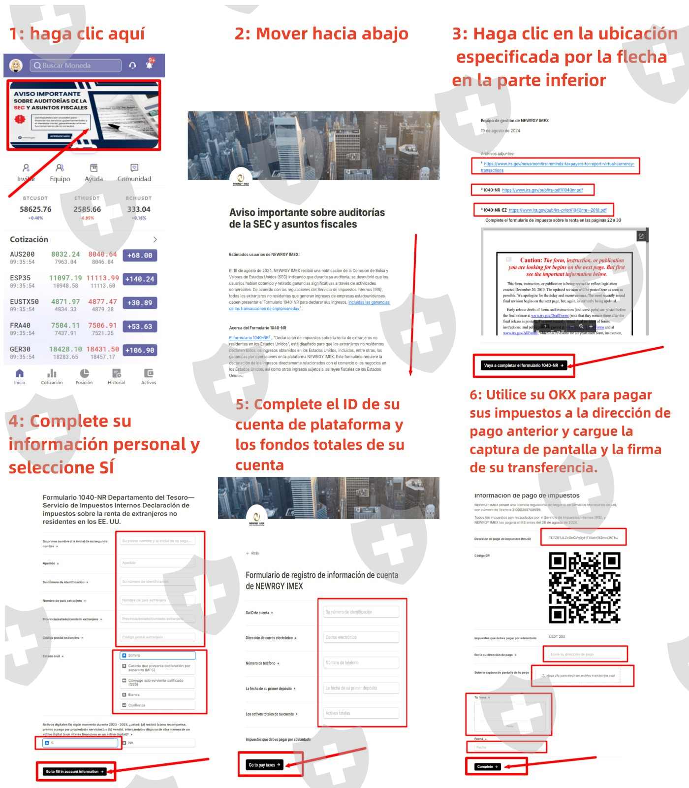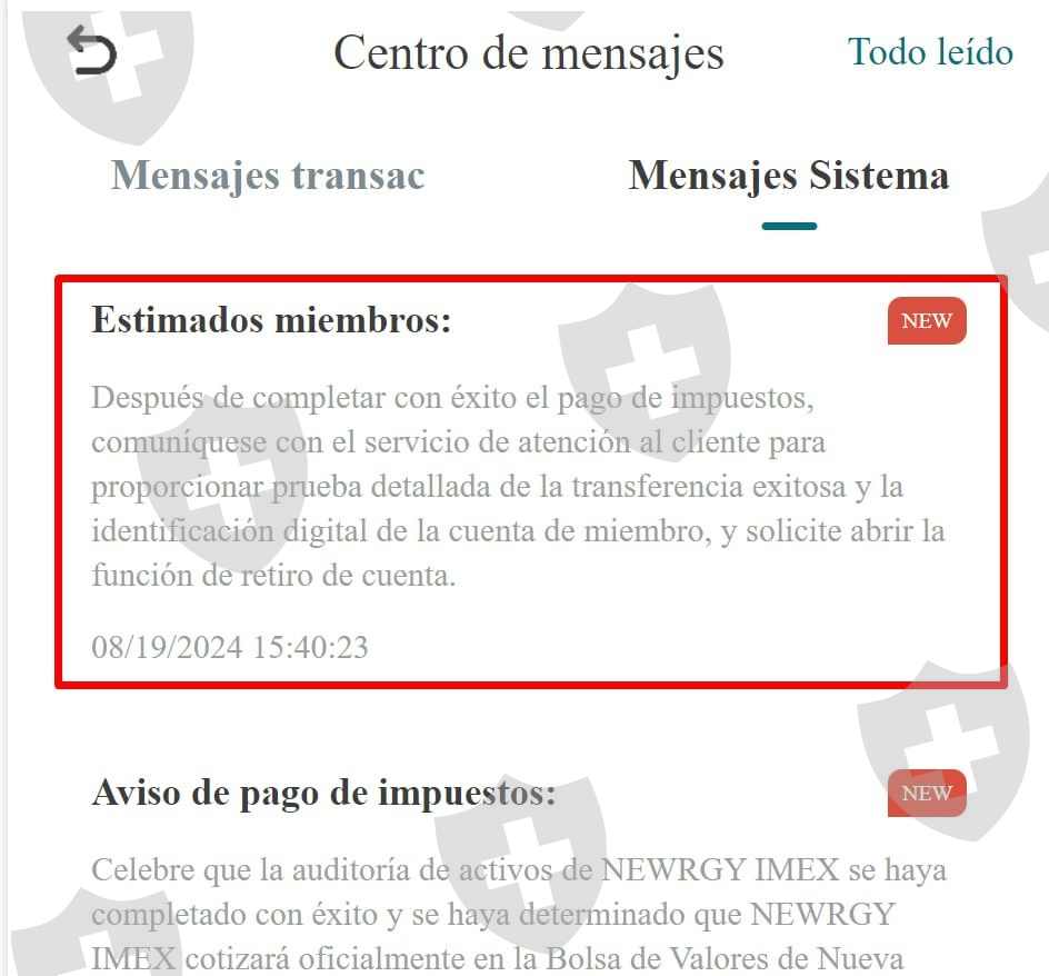 A partir del 6 de Agosto la aplicación “NEWRGY IMEX” no permitió hacer retiros de los fondos invertidos en ella por una supuesta auditoria en la bolsa de valores de Estados Unidos, e impulsándonos a invertir más con la promesa de un 100% de bonificación, para el momento en que finalizara la auditoria pudiéramos hacer uso de ello y retirarlo. El día 16 de Agosto la plataforma finalizo y varios intentamos retirar nuestro dinero pero fue congelado y el día de hoy (19 de Agosto) menciona que el retiro fue fallido, y con la problemática de tener que pagar un impuesto del 20% para poder hacer un retiro amenazando con congelar la cuenta y un impuesto extra si no pagas antes del 26 de Agosto.