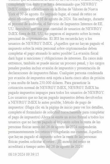 Primero menciono que tenian auditoria y se podia retirar el dinero despues del 16 de agosto, posteriomente sacaron que para retirar tenemos que pagar impuestos del 20% sobre la cantidad que tenemos, y al dia de hoy que se requiere hacer el retiro dice que fuera de horario. Al menos quiero recuperar lo que meti de dinero.