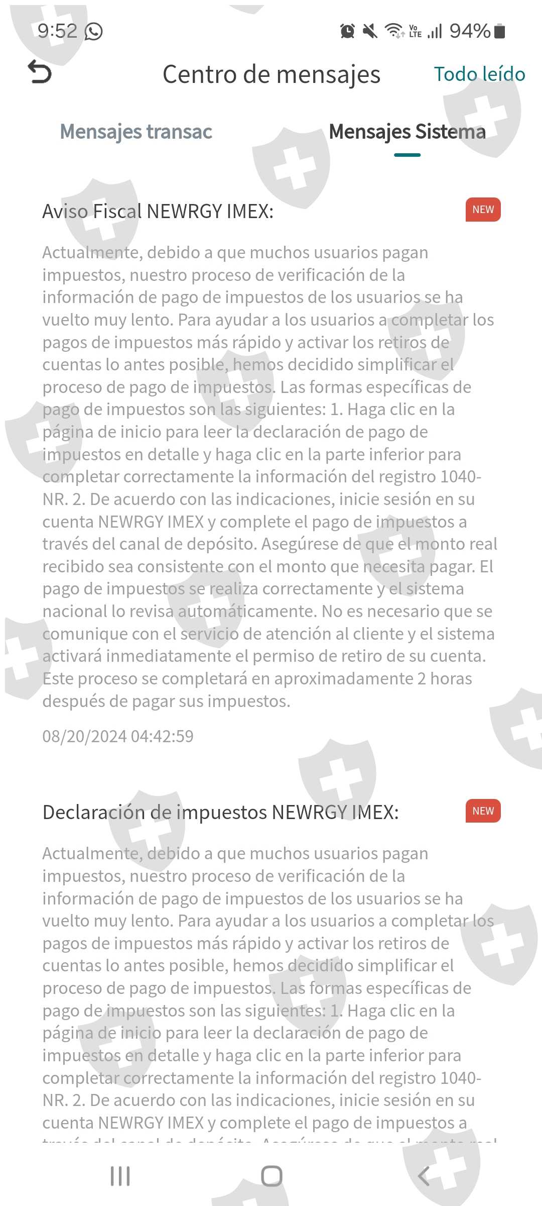 Hace 2 semanas que no podemos retirar el dinero de nuestras cuentas,por que estábamos en auditoria en la bolsa de valores de Nueva York que podríamos retirar nuestro dinero el 16 de agosto pero curiosamente cae en día viernes y sábado y domingo por no ser días avilés no te cae tu retiro, si no asta días avilés yo solicite un retiro y me tenia que caer el lunes más sin embargo se rechazo mi retiro ahora la excusa es que tenemos que pagar unos supuestos impuestos a NEWRGY qué por que ellos pagaron los impuestos de todos los usuarios de la plataforma y ahora nosotros tenemos que pagarles a ellos, pero amenazan que de no hacerlo dentro de 10 días tendremos problemas fiscales que podrían llevarnos a multas de 250000 dólares o 5 años de prisión y que nuestras cuentas serán congeladas, además de que nuevamente no podremos hacer ningún tipo de retiro asta no pagar ese impuesto, que corresponde al 20% del montón que tienes en tu cuenta. Y curiosamente me llegaron 500 dolares más sin yo meterlo