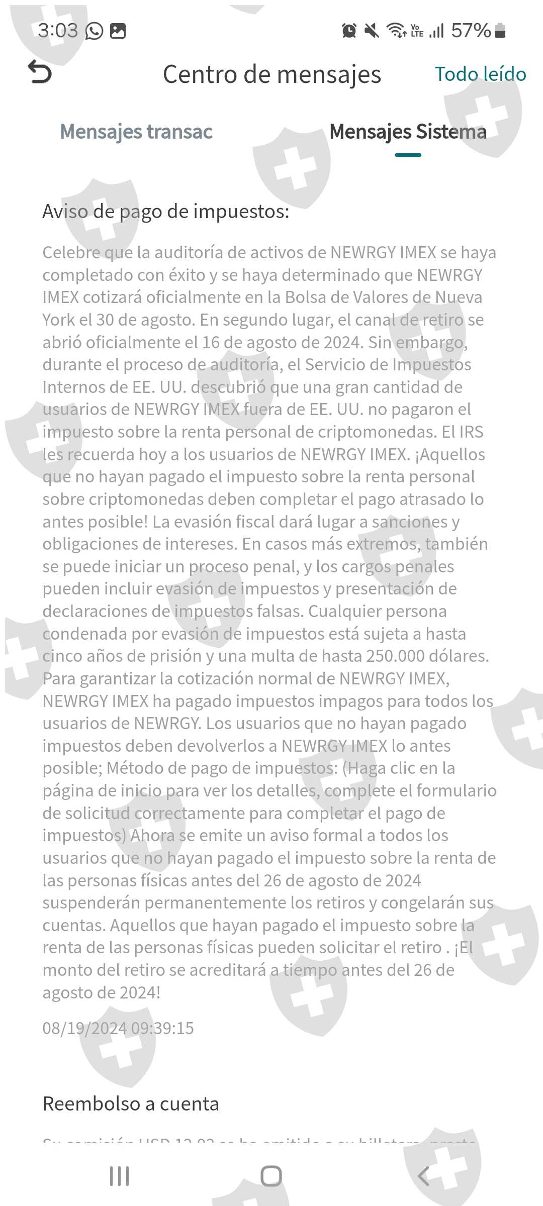 我们已经两周无法从账户中提取资金了,因为我们正在审计纽约证券交易所,我们可以在 8 月 16 日提取资金,但奇怪的是,它是在周五、周六和周日,因为它们不是阿维莱斯日. 你的提款不会落下,如果不是直到在阿维莱斯的几天我要求提款并且我不得不在周一落下,但是我的提款现在被拒绝了,借口是我们必须向 NEWRGY 缴纳一些所谓的税款,为什么他们要缴税该平台的所有用户,现在我们必须向他们付款,但他们威胁说,如果我们不在 10 天内这样做,我们将遇到税务问题,可能导致 25 万美元的罚款或 5 年监禁,并且我们的帐户将被冻结,除此之外,我们将无法进行任何类型的提款,直到我们缴纳税款(相当于您帐户金额的 20%)。奇怪的是,我没有投入就多了 500 美元。