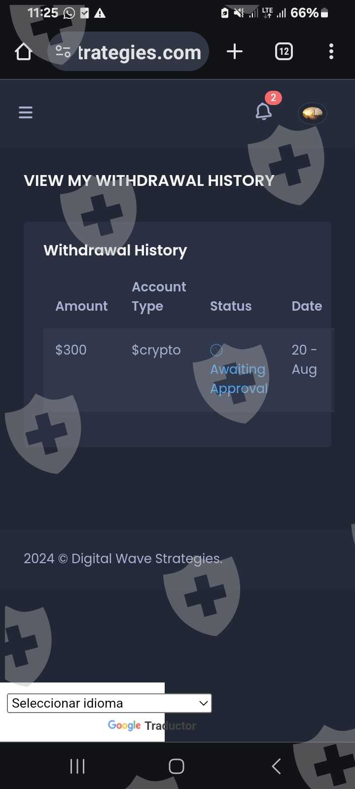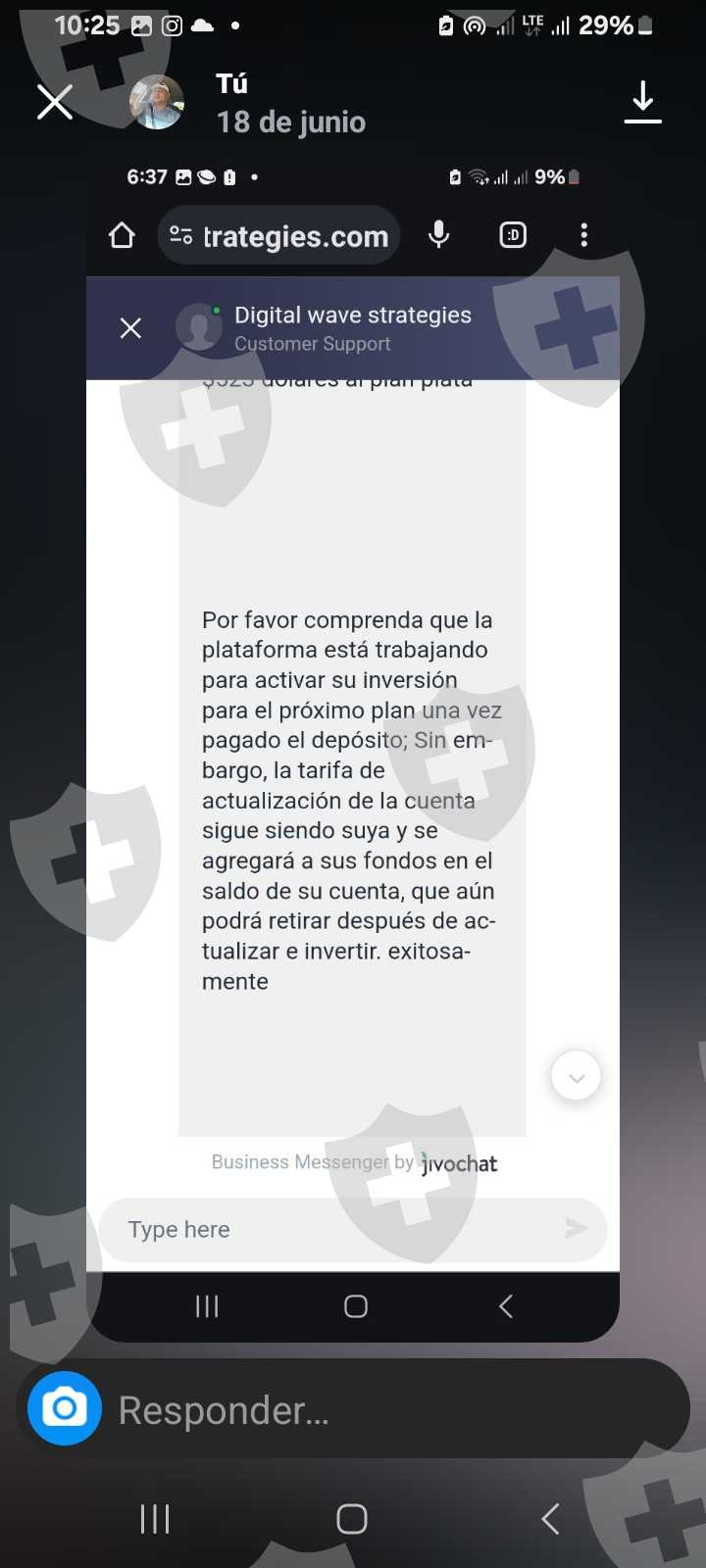 2024年5月26日,我向由两位有趣的用户Yina Love和Alexander Byagon推广的digitalwavestrategies公司存入了1,200美元,我将向您发送对话和照片,该公司接受了50美元的提款。几天后,我存入了 4,000,000 美元,因为该公司以每天 2.5% 的利润百分比工作了 5 天,据称适用于不同的青铜、白银和黄金计划,但由于公司向我发送了一些消息,所以我没有接受该计划。我必须存入 534 美元,伊势,他们没有给我钱,现在我想要 743 美元,根据那里的病毒和其他 exucas 的成本,我将发送我存入的对话的照片,该公司称为 digitalwavestrategies