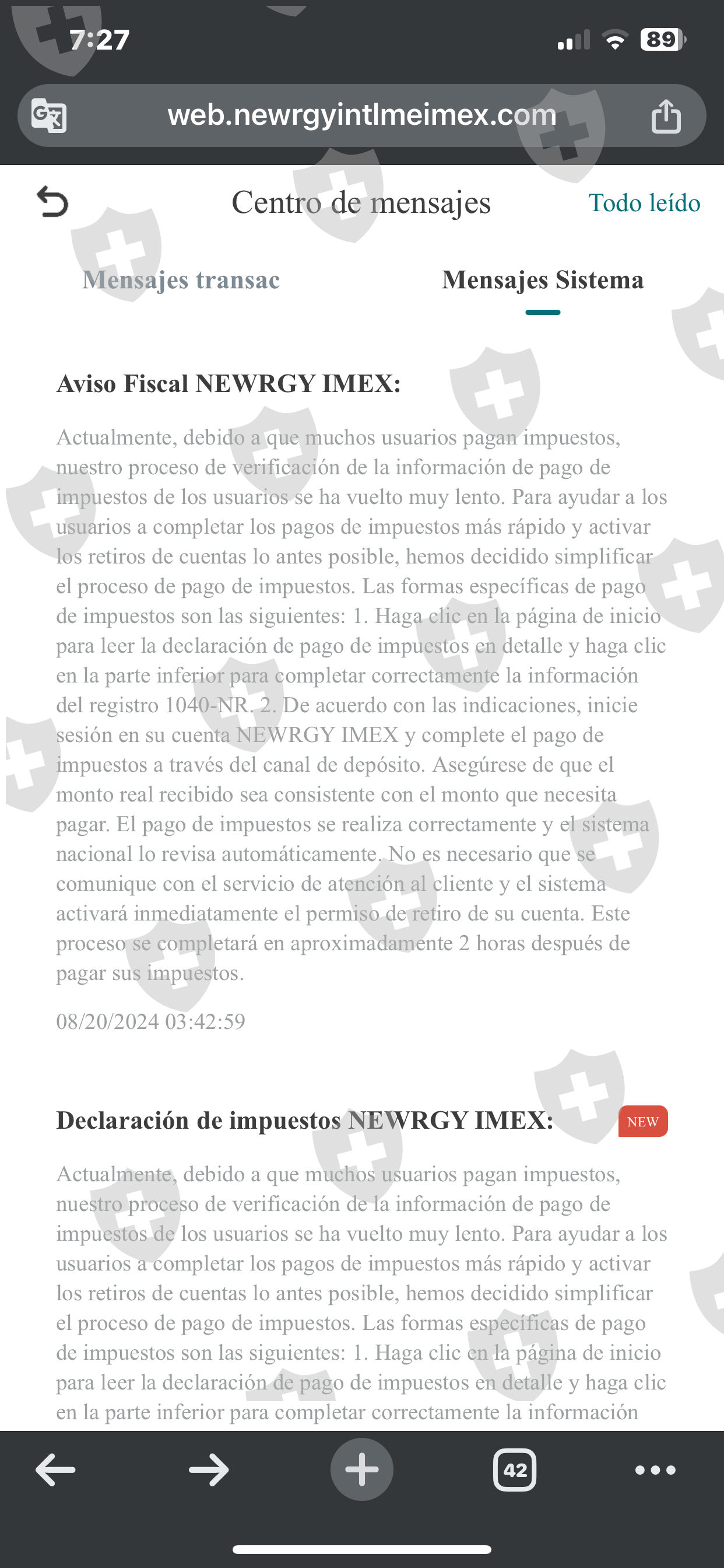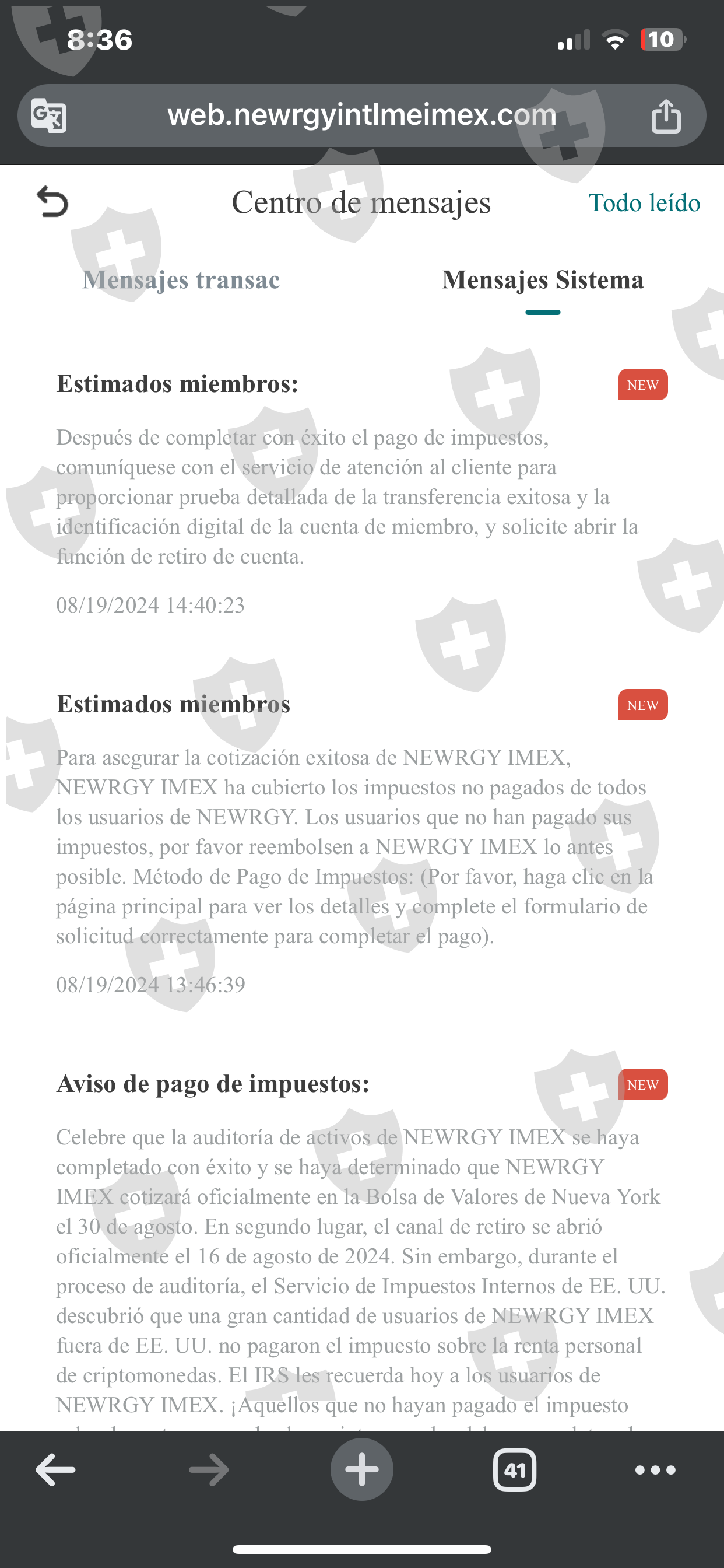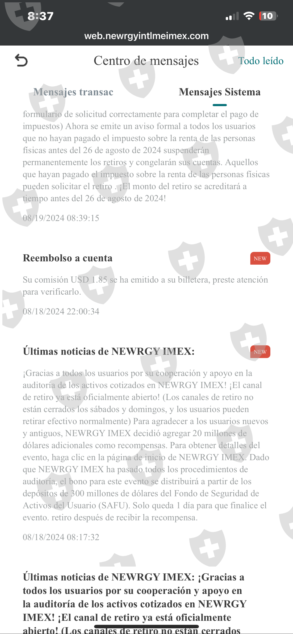 它要求你存钱,然后不再允许你取款,据说是因为加密货币的存入是通过 okx 进行的,据说它让我们在海耶日那天进行了突袭。已退回账户。 NEWRGY IMEX因为现在我们必须提前缴纳所谓的税款,如果没有在8月26日之前付款,账户将被冻结,我们将失去一切。