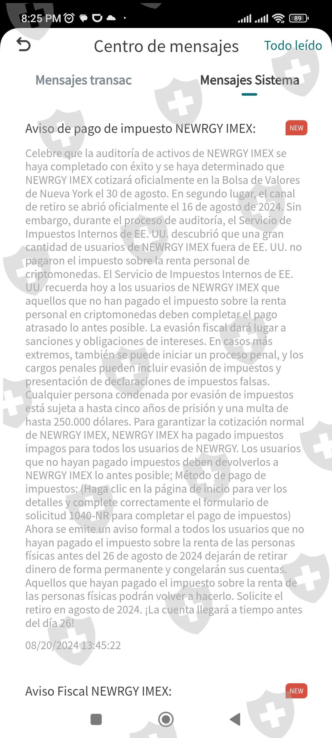 NEWRGY presento un bloqueo total a sus usuarios sobre el tema de retiro provocando asi la pérdida total de su fondos y según para poder tener la oportunidad de retirar tienes que pagar dicho impuesto lo cual es una estafa más a favor de NEWGRY