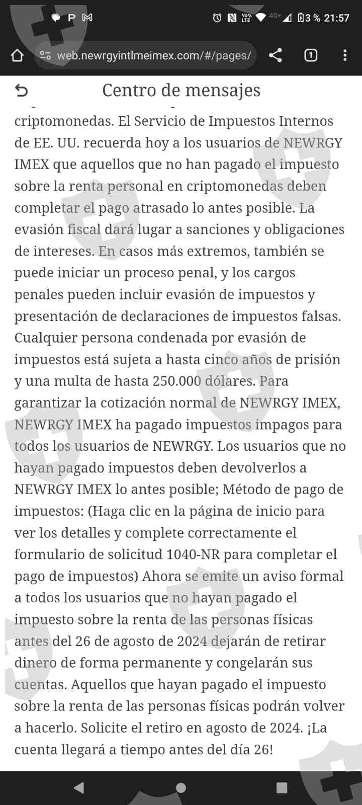 Invertí más de 6 mil dólares a la plataforma de Newrgy para trabajar en trading y desde el día 5 de agosto bloquearon la función de retiro de manera general con el supuesto argumento de una auditoria para cotizar en la bolsa de NY. Ahora está cobrando un 20% del total de los fondos por concepto de impuesto IRS, de no cubrir este pago antes del 26 de agosto, nuestra cuenta queda congelada definitivamente. esto a mí como a más personas nos perjudica ya que invertimos cantidad importante de nuestro patrimonio. espero me puedan ayudar a recuperar el dinero que invertí y está congelado dentro de la plataforma.