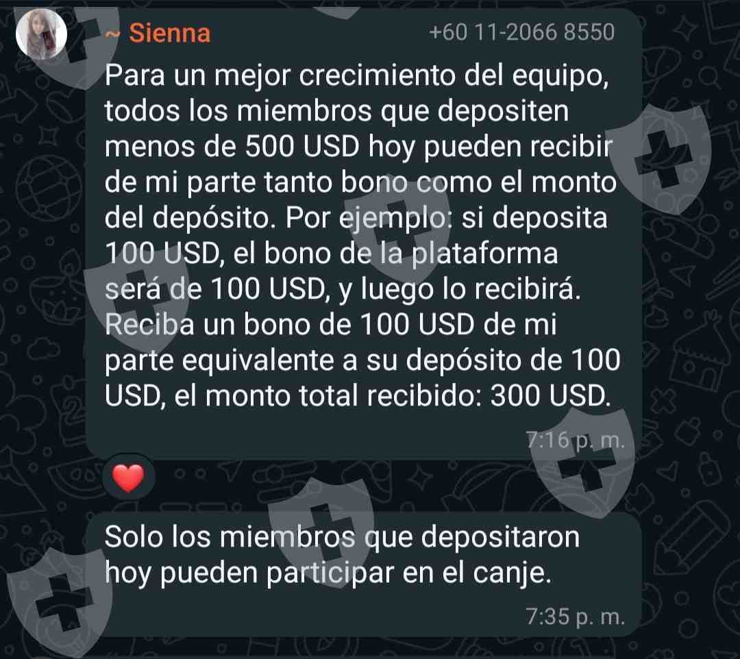 Durante este timepo nos incitaron con bonificacion del 100% cuando depositabas, varias personas estamos dentro de un grupo de whatsapp donde tenemos una supuesta lider que nos mandaba señales privilegiadas para invertir y en los ultimos dias extrañanmente tambien ofrecia recompensas adicionales a quien metia mas dinero a la plataforma