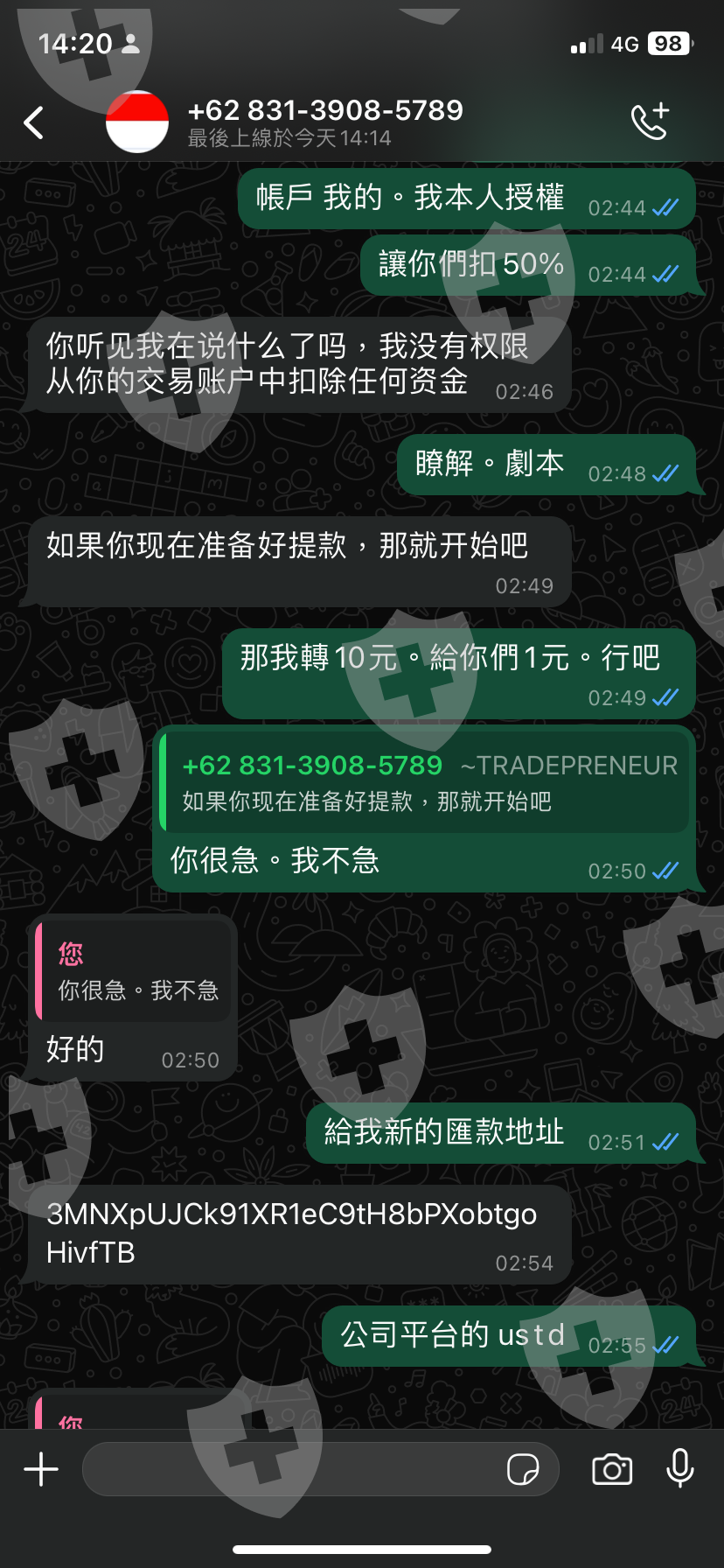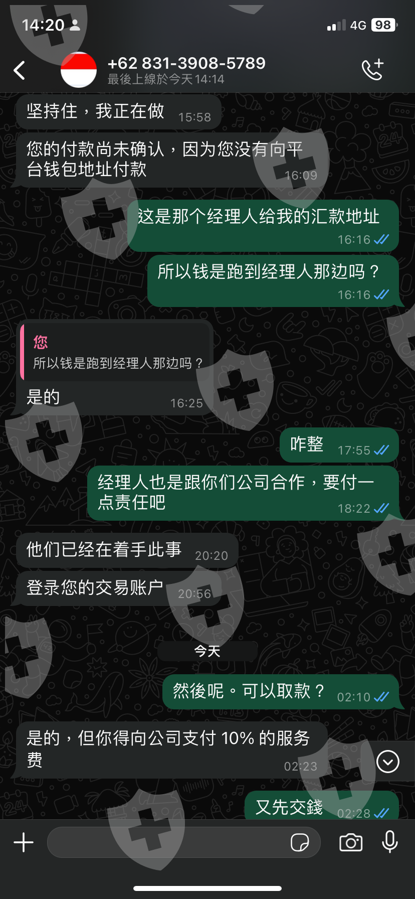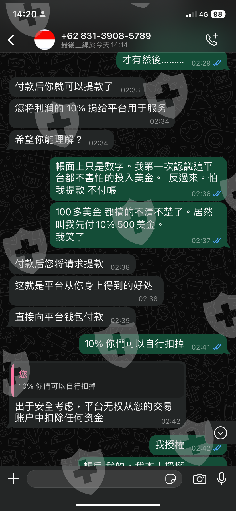 然而,當我再次嘗試提款時,對方卻要求我先支付平台抽成的10%,即520美元,並保證只要我付款就可以馬上提取餘額。這時,我更加確信這是一個精心設計的騙局,整個過程的目的是不斷榨取我的資金。