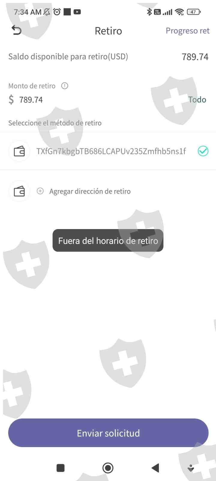 NEWRGY IMEX一切都很正常,直到8月8日他们以正在审核为由封锁提币,提币通道将在8月16日重新开放。从那天00:01开始,所以我提出了提款请求,它将在周一反映出来,但这并没有发生,当天提款被拒绝,我将其退回到我的钱包。当天晚些时候,该平台提到在该平台上进行操作必须缴税。但我必须另外存入一笔存款才能释放我的资金,因为它不允许我提取我的投资资金来支付它们,而我们直到 8 月 26 日才可以提取资金。否则他们将封锁账户。他们会保留我的投资